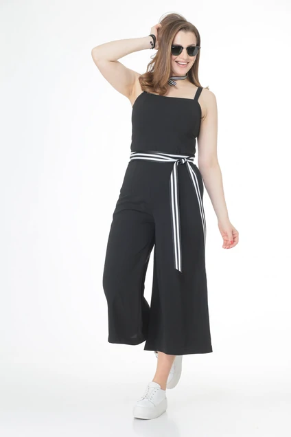 Комбинезон полуприлегающего силуэта с открытым лифом на бретелях. Лиф двойной. Бретели не регулируются. По спинке застежка «молния». Брюки расширены к низу. Пояс из декоративной поясной ленты фиксирует талию.