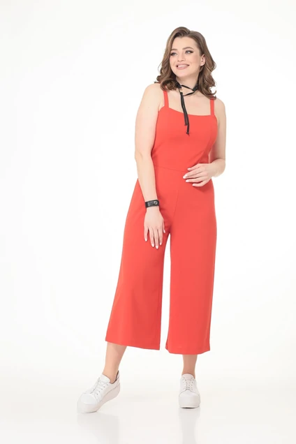 Комбинезон полуприлегающего силуэта из синтетического трикотажного полотна с открытым лифом на бретелях. Бретели не регулируются. По спинке застежка «молния». Брюки расширены к низу.