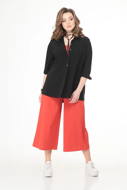 Рубашка свободного кроя, плечо спущено, по бокам шлица с застежкой на пуговицу. По переду планка с петлями и пуговицами, нагрудный карман. Воротник рубашечный классический, по низу рукава манжета.