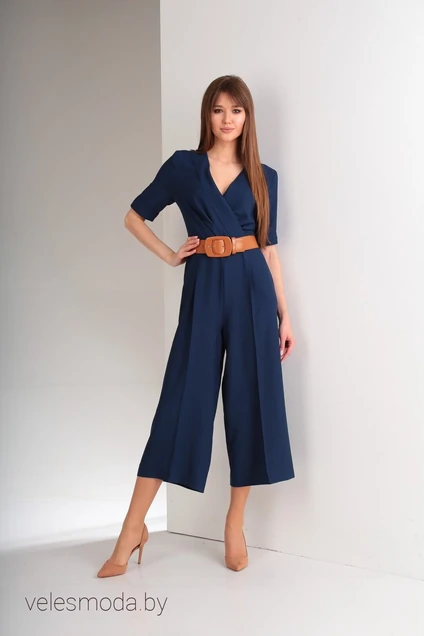 Комбинезон женский из костюмно-плательной ткани в классическом стиле отрезной по линии талии. По лифу переда: нагрудные и талиевые вытачки переведены в складки от линии талии, воротник цельновыкроенный талиевый. По лифу спинки: средний шов с застёжкой на потайную тесьму-молнию, талиевые вытачки. Нижняя часть изделия в виде брюк свободного покроя, расширенных книзу(кюлоты), со стрелками; карманы с бочком в боковых швах. Рукав втачной с отворотом по низу рукава. Съёмный пояс в комплекте. Модный тренд – комбинезон – прошёл по карьерной лестнице от одежды рабочего до офисной униформы стильных штучек. А вы в тренде? Длина по спинке 132, рукав 28,5.