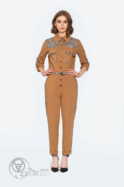 Длина изделия 143 см Длина рукава 60 см. Комбинезон выполнен из костюмной ткани в сочетании с контрастной отделкой. Спереди планка с застежкой на кнопки, накладные карманы с клапанами, по боковым швам вставлены карманы. Воротник отложной на стойке. Рукав втачной, длина регулируется пришивной патой. В комплекте пояс.