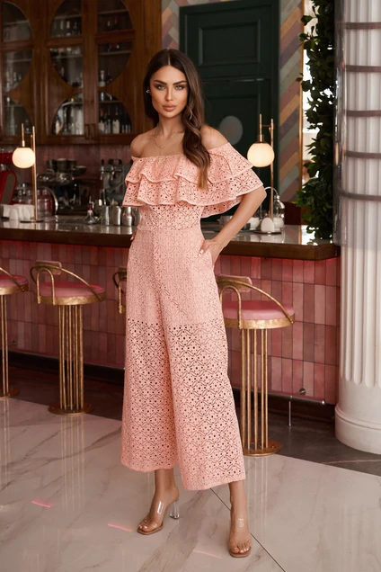 Комбинезон полуприлегающего силуэта, выполнен из гипюра. Комбинезон с открытой линией плеч. Линия верха с двойным воланом, собранным на резинку. Брюки прямые, укороченные, в боковых швах обработаны карманы. Застежка на потайную молнию в левом боковом шве. Верхняя часть брюк на подкладке.