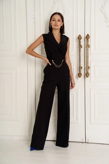 Комбинезон полуприлегающего силуэта, отрезной по талии, выполнен из костюмной ткани.Лиф комбинезона с запахом, отложными лацканами и небольшой сборкой по низу. Воротник пиджачного типа.Комбинезон без рукавов.В боковых швах брюк карманы. Брюки прямые, длинные.Застежка в среднем шве спинки на потайную молнию. Лиф комбинезона на подкладке.