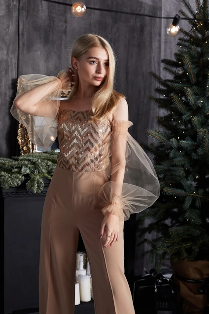 Комбинезон полуприлегающего силуэта, выполнен из плательной ткани в сочетании с сеткой и пайеточным полотном. Комбинезон отрезной по линии талии с открытой линией плеч. Линия верха фигурной формы. Перед лифа выполнен из пайеточного полотна. Рукав длинный, объемной формы, с оборкой по верху и низу. Рукава выполнены из сетки.Брюки прямые длинные, в боковых швах обработаны карманы.Застежка на потайную молнию в среднем шве спинки. Длина по спинке + шов сидения - 57 см. Длина по боковому от верха до низа - 130 см. Длина по боковому шву - 112 см. Длина по шаговому шву - 84 см. Длина рукава 64 см.