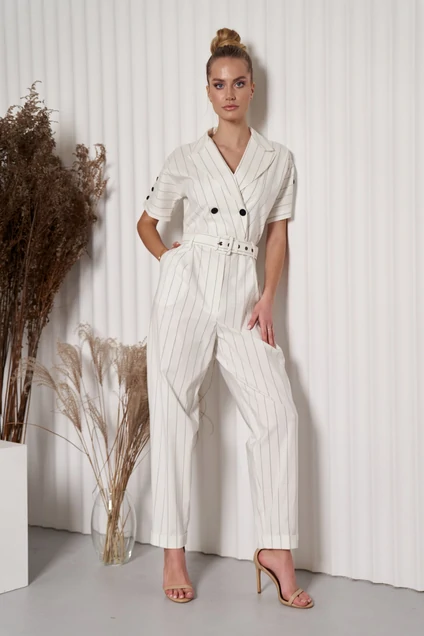 Комбинезон с мягкими складками от талии , из эластичной ткани.Застёжка двубортная на пуговицы, линия плеча приспущена.Короткие рукава с застёжкой на пуговицы, пиджачный воротник.Брюки с отворотами слегка заужены. Съёмный ремень с пряжкой. Рукав 35 см от горловины.