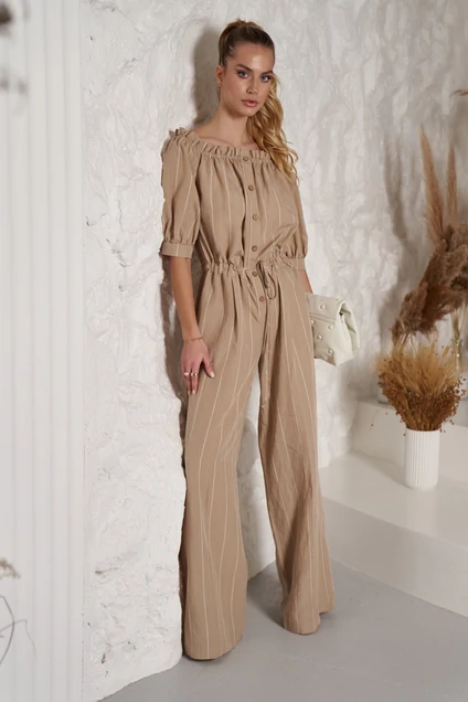 Комбинезон летний свободной формы.Открытые плечи.Вырез лодочка собран эластичной тесьмой.Застежка по переду на пуговицы.Талия фиксируется кулисой с резинкой и завязками.Рукав длиной до локтя.Низ рукава на манжете.Брюки прямые, свободные.