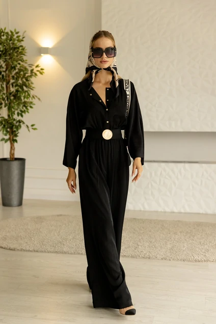 Комбинезон свободной формы из струящейся ткани, отрезной по линии талии, кулиса с резинкой. Перед на планке, застёжка на кнопки, круглая горловина. Рукав цельнокроеной, прямой, длина ¾. Брюки широкие, длинные, с боковыми наклонными карманами. В комплекте съёмный пояс. Рукав 60 см от горловины.
