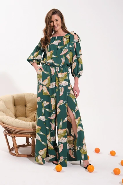 Комбинезон женский свободного силуэта. Плечевой пояс и низ рукавов на резинке. В талевый шов вставлена резинка для прилегания по линии талии. Брюки расширенные к низу, "палаццо". Передняя нижняя часть брюк с запахом создающим высокий разрез. В боковых швах выполнены карманы. В левое плечо вставлены декоративные бретели, создающие элегантный бан