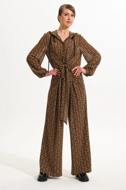 Комбинезон женский свободного силуэта.Верхняя часть комбинезона выполнена из шифона с принтом идентичным основной ткани.В талевый шов вставлена резинка для прилегания по линии талии.Брюки расширенные к низу, "палаццо".Передняя нижняя часть брюк со встречными складками.Рукав втачной одношовный, низ рукава обработан резинкой.Перед с дополнительными складками, переходящими в завязки, которые образуют бант.На верхней части переда выполнена застежка на петли-пуговицы.В горловину вставлен капюшон.По краю капюшона выполнена кулиса со шнуром.