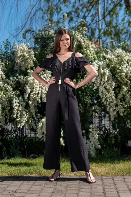 Элегантность, женственность и комфорт. Комбинезон из легкой натуральной ткани с V-образным вырезом горловины, воланом по переду и спинке оформляющим верх, прямыми брюками и поясом.