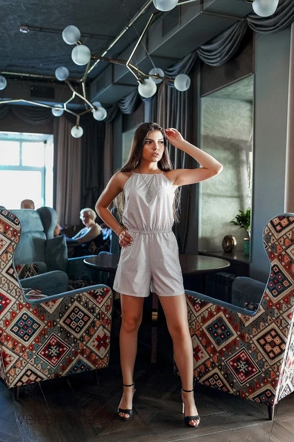 Легкий комбинезон без рукавов с шертами из белой ткани в мелкий черный горошек. На талии резинка. Сзади имется разрез до талии, а так же завязки.