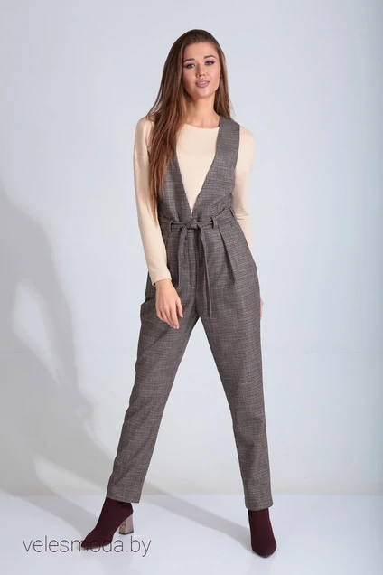 Комбинезон женский отрезной по линии талии. Верхняя часть комбинезона на подкладке. Верхняя и нижняя части комбинезона соединены поясом, на котором расположены шлевки. Застежка «гульфик» на молнии. По передним половинкам брюк расположены карманы и по одной мягкой складке. Завязывающийся пояс в комплекте. Длина брюк от пояса 101 см (для роста 164 см), 104 см (для роста 170 см).