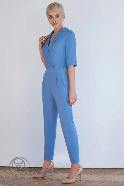 Женские комбинезоны отлично вписываются в любой гардероб, потому что они не только универсальны, но и могут сделать ваш образ стильным и необычным. Комбинезон женский, полуприлегающего силуэта для повседневной носки, отрезной по линии талии с притачным поясом. Верхняя часть переда на запáх, с талевыми вытачками. Нижняя часть переда с боковыми карманами, с наклонной линией входа и 2-я встречными складками, идущими от входа в карман. Верхняя часть спинки с талевыми вытачками и средним швом, нижняя часть переда так же с талевыми вытачками, идущими от шва притачивания пояса. В среднем шве спинки обработана застёжка на потайную тесьму-молнию. Рукава втачные, одношовные, короткие. Низ рукава обработан притачной манжетой. Горловина с воротником пиджачного типа. Длина комбинезона по спинке от горловины до пояса – 40,5см, длина брюк до низа с поясом – 100см, длина рукава с манжетой– 33см.