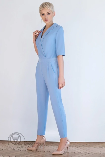 Женские комбинезоны отлично вписываются в любой гардероб, потому что они не только универсальны, но и могут сделать ваш образ стильным и необычным. Комбинезон женский, полуприлегающего силуэта для повседневной носки, отрезной по линии талии с притачным поясом. Верхняя часть переда на запáх, с талевыми вытачками. Нижняя часть переда с боковыми карманами, с наклонной линией входа и 2-я встречными складками, идущими от входа в карман. Верхняя часть спинки с талевыми вытачками и средним швом, нижняя часть переда так же с талевыми вытачками, идущими от шва притачивания пояса. В среднем шве спинки обработана застёжка на потайную тесьму-молнию. Рукава втачные, одношовные, короткие. Низ рукава обработан притачной манжетой. Горловина с воротником пиджачного типа. Длина комбинезона по спинке от горловины до пояса – 40,5см, длина брюк до низа с поясом – 100см, длина рукава с манжетой– 33см.