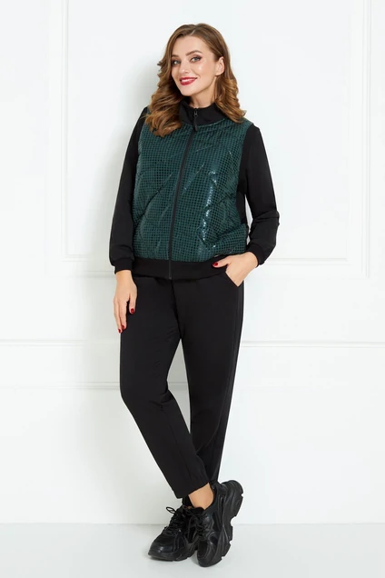 Стильный спортивный комплект, состоит из жилета, джемпера и брюк. Джемпер прямого силуэта, выполнен из высококачественного трикотажа. Перед джемпера декорирован стильной печатью. Брюки прямые, на поясе с резинкой и завязкой на шнур. Низ брюк с манжетой из резинки. Жилет по переду выполнен из стеганой ткани с трикотажным довязом, спинка из высококачественного трикотажа. Жилет по переду с застежкой на металлическую молнию. Модель стильная и практичная, прекрасно подойдет для ежедневной носки.