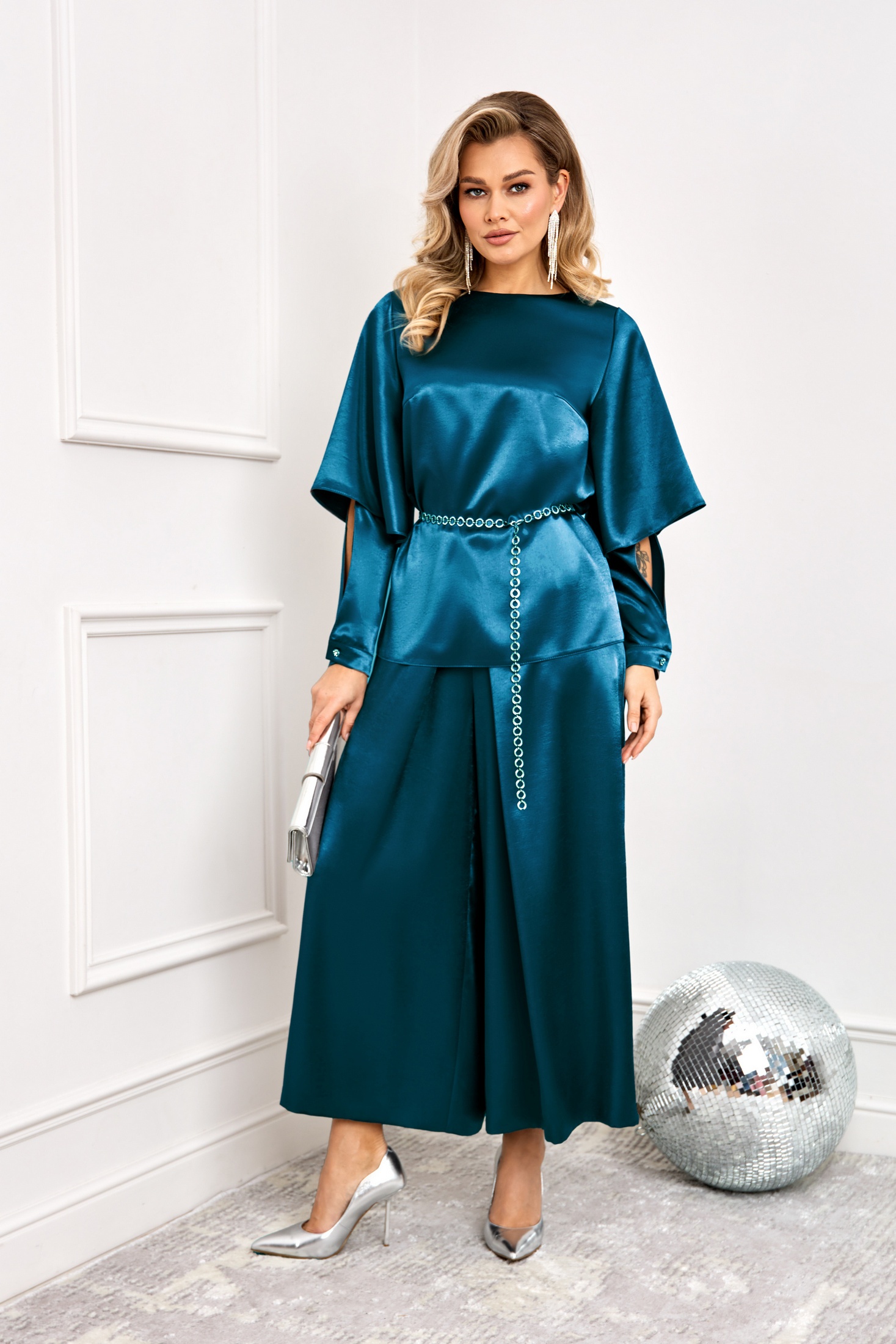 Элегантный и нарядный комплект, состоит из блузы и брюк. Изящная блуза прямого силуэта, выполнена из высококачественной ткани Твист с добавлением вискозы. Горловина блузы с округлым вырезом, по низу, по бокам, с небольшими разрезами. Рукав втачной, снизу с манжетой и застежкой на пуговицу. По спинке блуза с небольшим разрезом-капелькой и застежкой на пуговицу. Брюки прямые, выполнены из высококачественной ткани Твист с добавлением вискозы, по переду и спинке со складками, что придает модели особый шарм и нарядность. Пояс брюк по спинке с резинкой и застежкой сбоку на потайную молнию и пуговицу. Модель прекрасно подойдет для торжественного мероприятия и ежедневной носки. В комплект входит пояс-цепочка серебристого цвета, для придания образу еще большей нарядности и стильности.