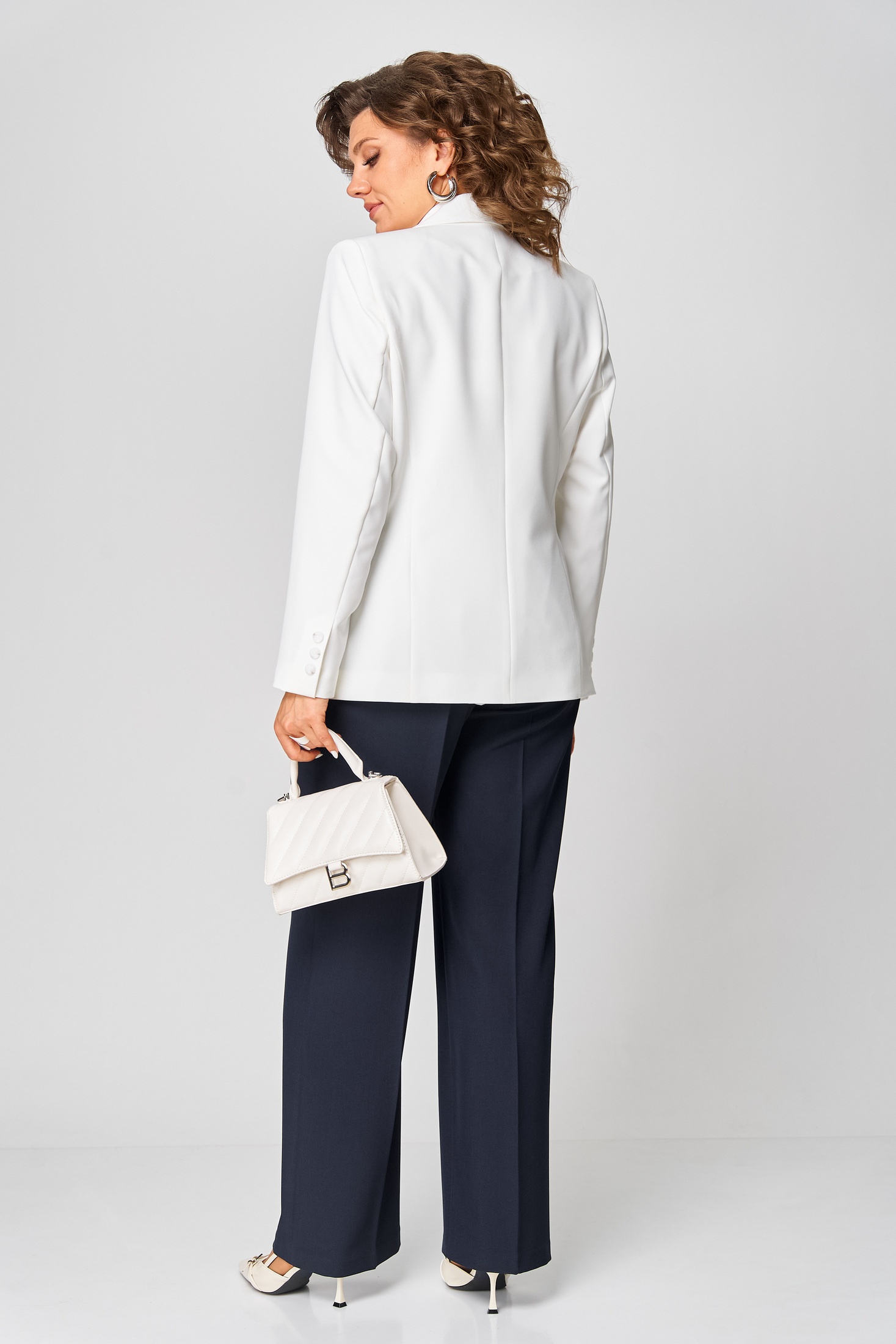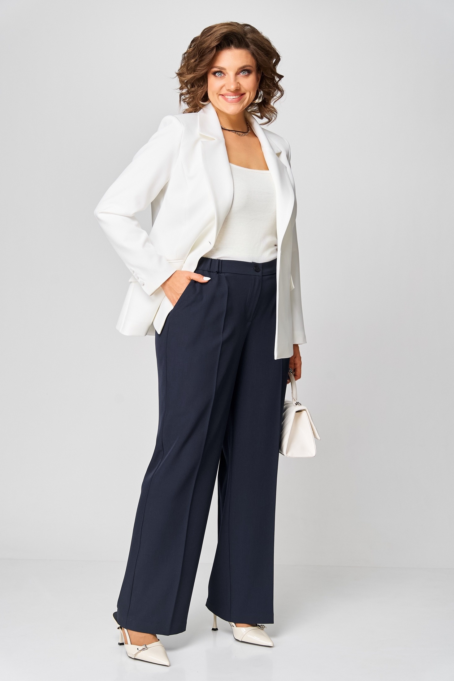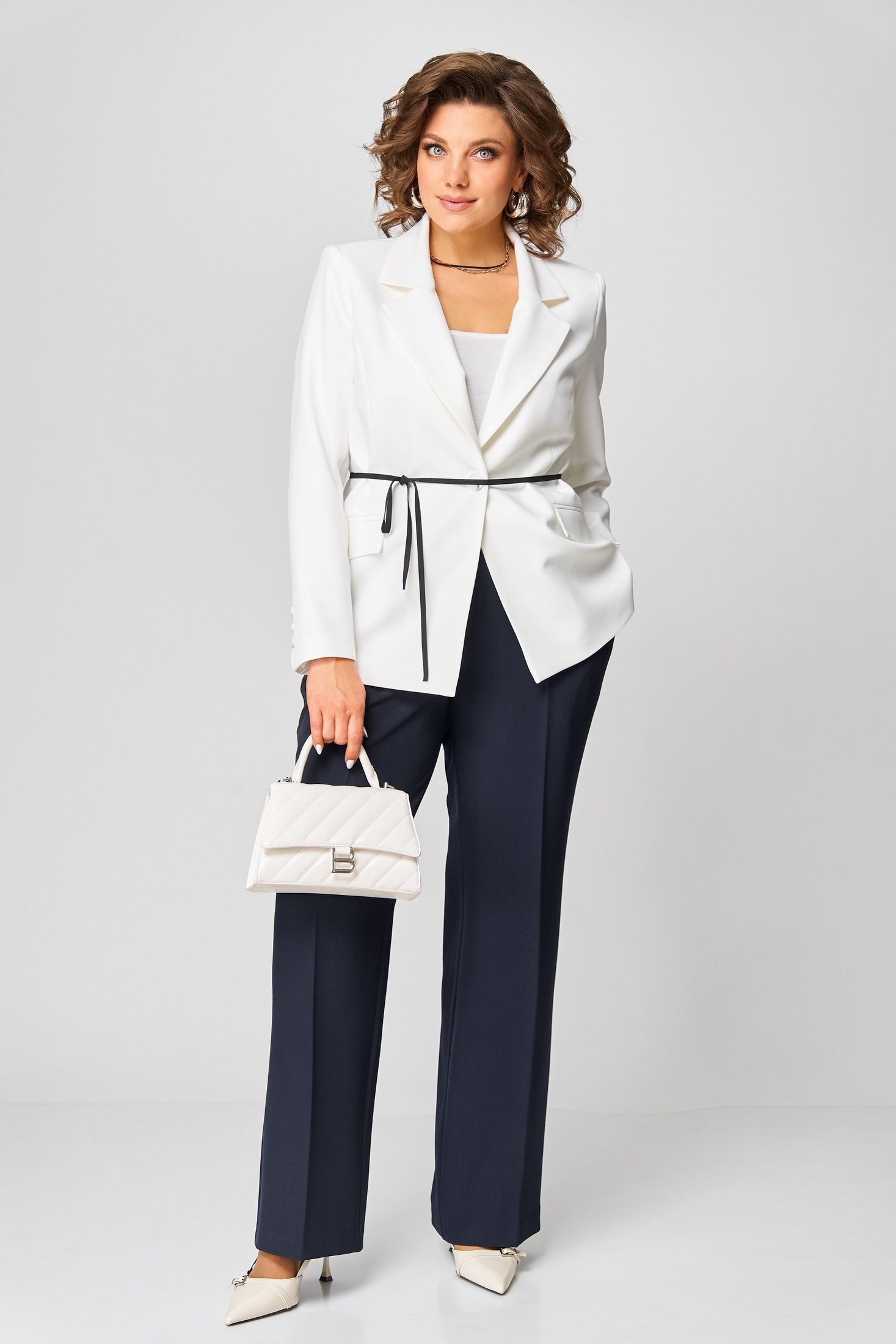 Комплект идеально подходит для офиса, деловых переговоров или светских встреч, где важно подчеркнуть уверенность и вкус. Лаконичный крой, благородные оттенки и безупречный баланс строгих и женственных деталей делают этот ансамбль универсальным выбором для стильной женщины. Жакет слегка притален, удлиненный, с центральной застежкой на 1 петлю и пуговицу, с воротником пиджачного типа. Низ бортов прямой. По переду бочек и функциональные карманы с клапаном. Спинка со средним швом без особенностей. Рукава втачные, двухшовные декорированные пуговицами и шлицей. Брюки прямого силуэта с заутюженными стрелками и притачным поясом. Для максимально комфортной посадки по бокам пояса вставлена эластичная резинка. Застёжка на молнию с гульфиком и пуговица по поясу. По переду в боковых швах карманы. Задние половинки брюк с талевыми вытачками. Этот образ — воплощение современного стиля деловой женщины. Молочный жакет с тонким синим поясом подчеркивает фигуру и добавляет изысканной строгости. Контрастные тёмно-синие брюки вытягивают силуэт, делая его более стройным и элегантным.