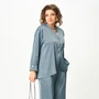 Жакет с запахом и акцентом на талию формирует женственный силуэт и визуально вытягивает фигуру. Застежка на две нависные петли и золотистые пуговицы с декоративной завязкой по левой части переда добавляет нотки гламура. По переду талевые вытачки и накладные клапаны. Воротник шалевый с небольшой стой. Рукав втачной двухшовный с разрезом по низу. Брюки широкие с мягкими складками по переду и боковыми карманами вблизи боковых швов, подчёркивают лёгкость и свободу движения. Для максимально комфортной посадки по поясу вставлена эластичная резинка по спинке и бокам.