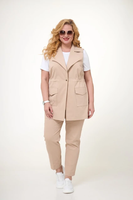 Жилет прямого силуэта с застежкой на одну пробивную кнопку с кулисой по талии и шнуром, фиксирующим степень прилегания. Жилет без подкладки.