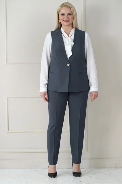 Комплект женский 3-х предметный состоящий из жилета, блузки брюк. Жилет полуприлегающего силуэта, на подкладке, с центральной застёжкой на петлю и пуговицу, с отрезными бочками со смещёнными боковыми швами, с поясом. Перед с рельефными швами и прорезными карманами с двумя обтачками. Спинка со средним швом. Брюки длинные, со сгибом, на притачном поясе по боковым на резинке. Застежка типа «гульфик» в среднем шве на тесьму-молнию и петлю и пуговицу по поясу. Передние части с имитацией косых карманов. Задние части с талевыми выточками. Блузка прямого силуэта с застёжкой по притачной планке на петли пуговицы, с V–образным вырезом.