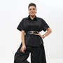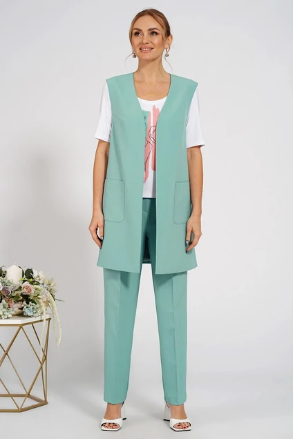 Комплект женский 3-х предметный состоит из жилета, блузы и брюк. Жилет женский прямого, свободного силуэта, на подкладке, распашной без застёжки (встык), боковые швы с ассиметричной застёжкой на пробивные петли и пуговицы. Перед с нагрудными выточками и накладными карманами. Спинка со средним швом. Блузка женская полуприлегающего силуэта. Декорированная по переду печатью. Рукава втачные, одношовные, короткие. По горловине втачная бейкой. Брюки женские р46-50 полуприлегающего силуэта, со сгибом, на притачном поясе из частей, с застёжкой типа «гульфик» по среднему шву переда на тесьму-молнию и петлю, пуговицу по поясу. Передние и задние части с талевыми выточками.