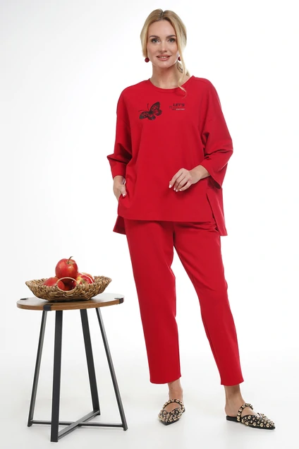 Блузон прямого, свободного силуэта, со спущенной линией плеча, плечевой шов, смещённый на перед, с разноуровневым низом. Перед с рельефными швами заканчивающиеся разрезами. Спинка понизу отрезная. Рукава цельнокроеные с боковыми частями переда и спинки. По горловине бейка. Декорированный блузон по переду печатью и термоаппликацией.