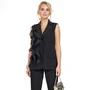 Жилет полуприлегающего силуэта, с застёжкой на петли, пуговицы, в дополнении с ремнем. Декорированный по переду воланами (выполненные из отделочной ткани органза). Перед с рельефными швами и декоративным клапаном. Спинка со средним швом и рельефными швами. Воротник отложной с отворотом.