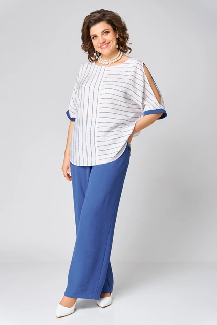Костюм женский состоящий из топа и брюк.Топ с рисунком "полоска" прямого силуэта с овальным вырезом горловины и асимметричной линией низа. Перед со средним швом , спинка со средним швом и "У" образным вырезом горловины с отделочными деталями из материала контрастного по цвету. Рукава цельнокроенные с овальными прорезями ниже плеча и притачными манжетами из отделочной ткани. Брюки прямые широкие на притачном поясе с резинкой, с боковыми карманами.