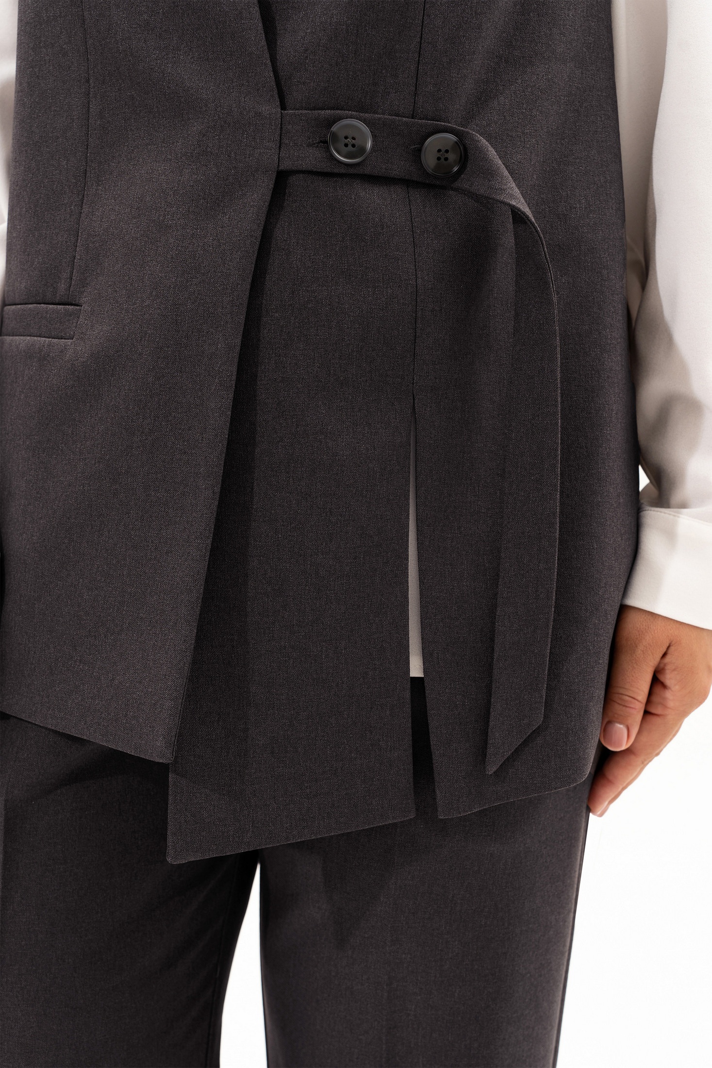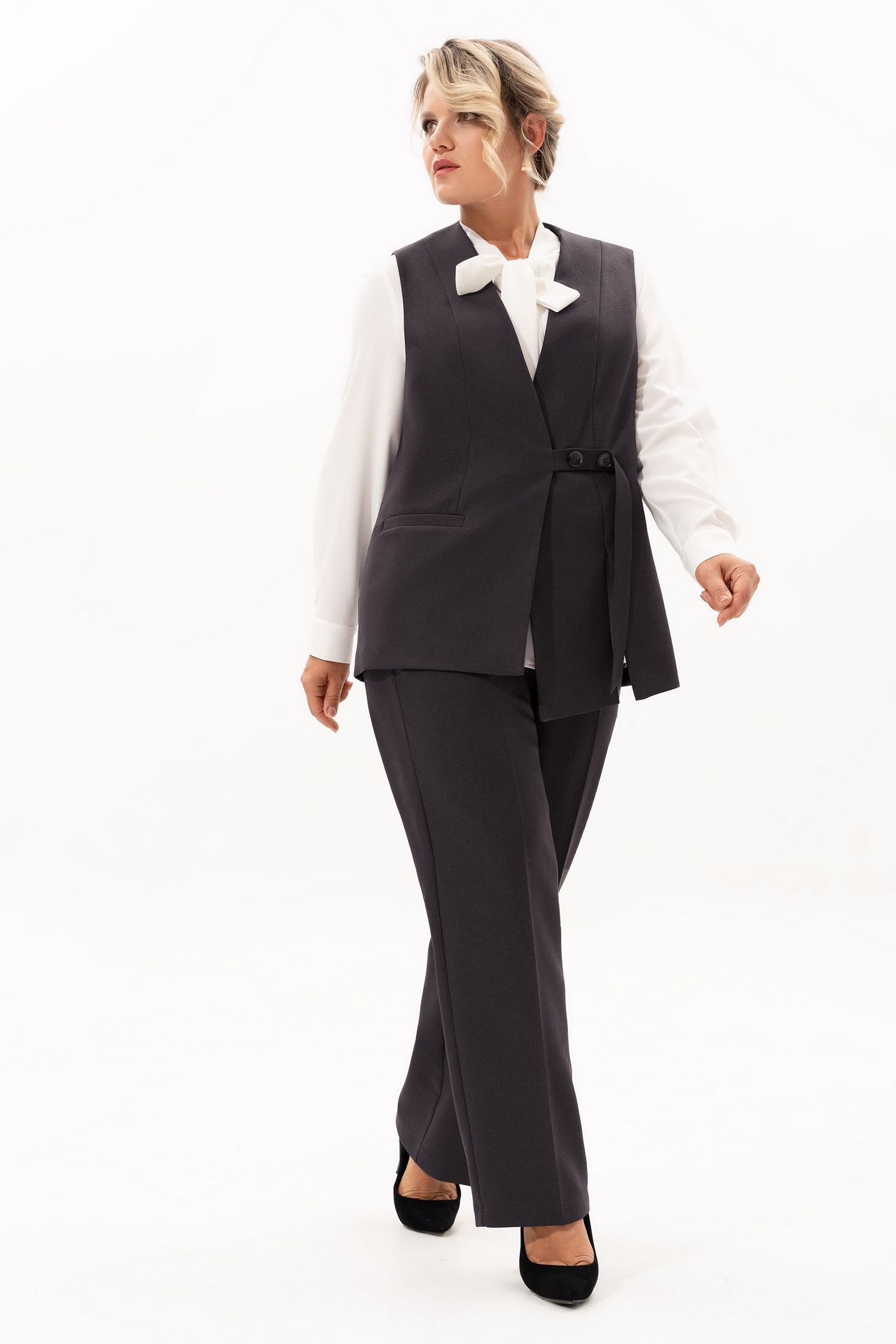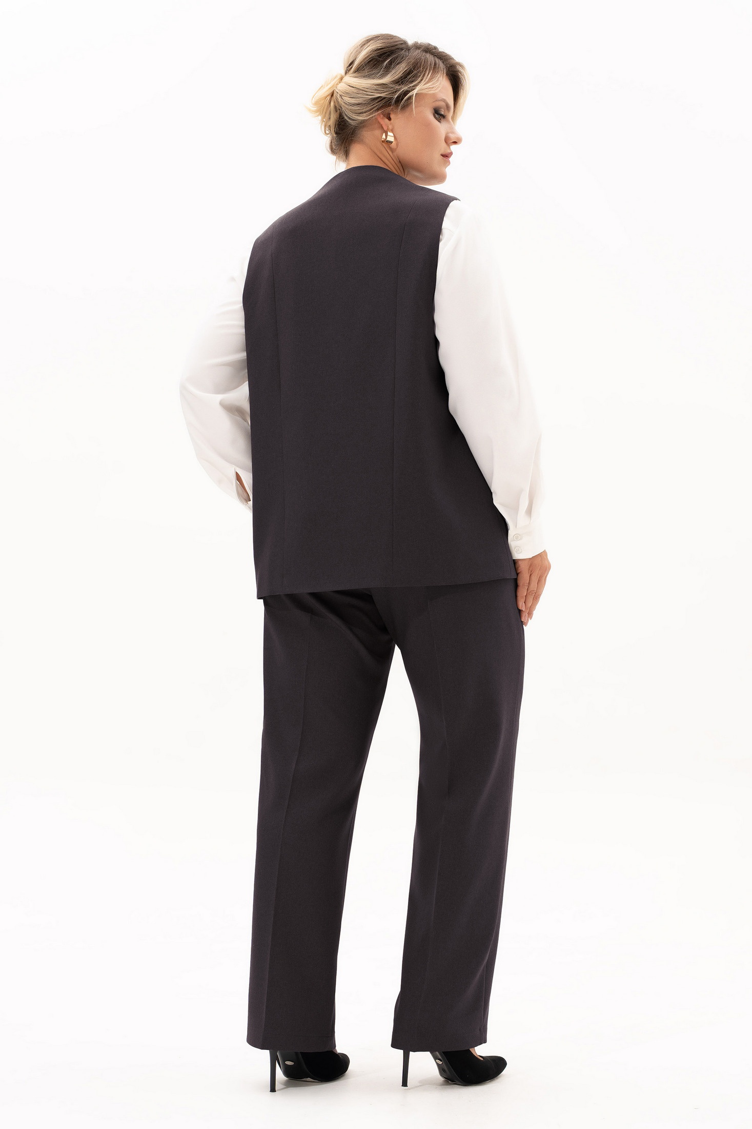 Костюм брючный 4068-2 Algranda (Новелла Шарм) объединяет классический стиль с современной элегантностью. Коллекция бренда Algranda создана из качественной вискозной ткани, дополненной полиэстером и эластаном, что обеспечивает комфорт и удобство носки. Комплект включает прямые брюки с высокой посадкой и универсальный жилет с V-образным вырезом, подкладкой и декоративными деталями, такими как прорезной карман и разрез на полочке. Идеально подходит для офисной работы, а также для вечерних мероприятий при сочетании с нарядной блузкой. Черный цвет костюма подчеркивает его универсальность, делая его подходящим для любого сезона и события.