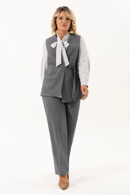 Нарядно- повседневный комплект это идеальное решение для Вашего гардероба. Комплект состоит из трех предметов - прямые брюки с высокой посадкой прямого кроя на молнии и на резинке, с боковыми карманами сочетаются с любыми базовыми вещами. Универсальный классический жилет с V-образным вырезом горловины превосходно садится по фигуре, на правой полочке обработан прорезной карман с листочкой, на левой разрез , застежка обработана на отлетном хлястике ,на петлю и пуговицу. Этот элемент делает его более интересным. Жилет на подкладке . Ассиметричный жилет можно одевать поверх тонкой одежды. Прекрасная классическая блуза с воротником - бантом имеет прямой крой, поэтому отлично подходит для любого типа фигуры. Спинка со средним швом. По переду блузы есть рельефы от плечевого шва, в боковых швах - небольшие разрезы. Блуза изготовлена из приятной к телу ткани, гладкая фактура не мнётся и сохраняет свой первоначальный вид даже после многократных стирок. Рукав втачной, одношовный, длинный с манжетой на две петли и пуговицы. Комфортная модель для работы и просто для повседневного применения, так и к композиции нарядного ансамбля. Элегантная блуза с бантом - утончённая универсальность, комфорт. Базовый брючный комплект идеален для повседневного образа- деловая встреча, в офис. Современный комплект также будет хорошо смотреться как вечерний наряд на различные мероприятия, праздники, день рождения, корпоратив. Шикарный нарядный станет незаменимым в Вашем гардеробе . Этот комплект подчеркнет Вашу уверенность и стиль. Длина брюк (см): 105 Длина жилета (см): 74 Длина блузы (см): 69 Длина рукава блузы (см): 62