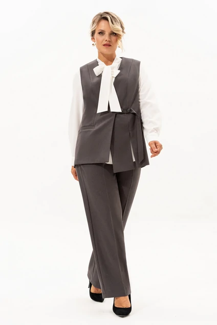Нарядно- повседневный комплект это идеальное решение для Вашего гардероба. Комплект состоит из трех предметов - прямые брюки с высокой посадкой прямого кроя на молнии и на резинке, с боковыми карманами сочетаются с любыми базовыми вещами. Универсальный классический жилет с V-образным вырезом горловины превосходно садится по фигуре, на правой полочке обработан прорезной карман с листочкой, на левой разрез , застежка обработана на отлетном хлястике ,на петлю и пуговицу. Этот элемент делает его более интересным. Жилет на подкладке . Ассиметричный жилет можно одевать поверх тонкой одежды. Прекрасная классическая блуза с воротником - бантом имеет прямой крой, поэтому отлично подходит для любого типа фигуры. Спинка со средним швом. По переду блузы есть рельефы от плечевого шва, в боковых швах - небольшие разрезы. Блуза изготовлена из приятной к телу ткани, гладкая фактура не мнётся и сохраняет свой первоначальный вид даже после многократных стирок. Рукав втачной, одношовный, длинный с манжетой на две петли и пуговицы. Комфортная модель для работы и просто для повседневного применения, так и к композиции нарядного ансамбля. Элегантная блуза с бантом - утончённая универсальность, комфорт. Базовый брючный комплект идеален для повседневного образа- деловая встреча, в офис. Современный комплект также будет хорошо смотреться как вечерний наряд на различные мероприятия, праздники, день рождения, корпоратив. Шикарный нарядный станет незаменимым в Вашем гардеробе . Этот комплект подчеркнет Вашу уверенность и стиль. Длина брюк (см): 105 Длина жилета (см): 74 Длина блузы (см): 69 Длина рукава блузы (см): 62