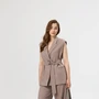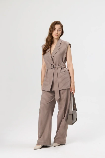 Костюм женский двупредметный, полуприлегающего силуэта из костюмно-плательной мягкой поливискозы, состоящий из жилета-жакета и деликатных брюк- палаццо. Жилет прямой с чуть расширенной линией плеч, полуприлегающий за счёт съёмного пояса из основной ткани с регулирующейся пряжкой-полукольцо. Перед с прорезными функциональными карманами в рамку и притачным бочком, цельнокроённым с бочком спинки. Воротник отложной пиджачный. Жилет на поливискозной подкладке. Брюки- палаццо на притачном поясе со шлёвками, со складками и застёжкой спереди, функциональными карманами с отрезным бочком в боковых швах. На задних половинках брюк имеются парные талиевые вытачки.