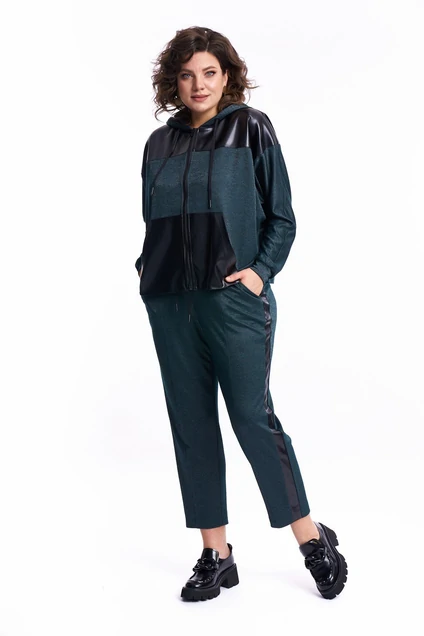 Спортивный брючный костюм, выполнен из трикотажного полотна. Худи свободного силуэта с центральной застежкой на молнию. Кокетки и карманы выполнены из экокожи.Рукав цельнокроеный с притачной манжетой по низу. По горловине капюшон. Брюки на притачном поясе с резинкой и шнурком без застежки. Карманы боковые. Вставки из экокожи по боковым швам. Длина спинки 58 см, длина рукава от горловины - 75 см, длина брюк 92 см. 50 размер: ОГ худи 152см, ОБ худи - 124 см; ОТ брюк - 66см (без резинки) до 92см ( с резинкой), ОБ- 114см; 52 размер: ОГхуди 156см, ОБ худи - 128 см; ОТбрюк - 70см (без резинки) до 96см ( с резинкой), ОБ- 118см; 54 размер: ОГхуди 160см, ОБ худи - 132 см; ОТбрюк - 74см (без резинки) до100см ( с резинкой), ОБ- 122см.