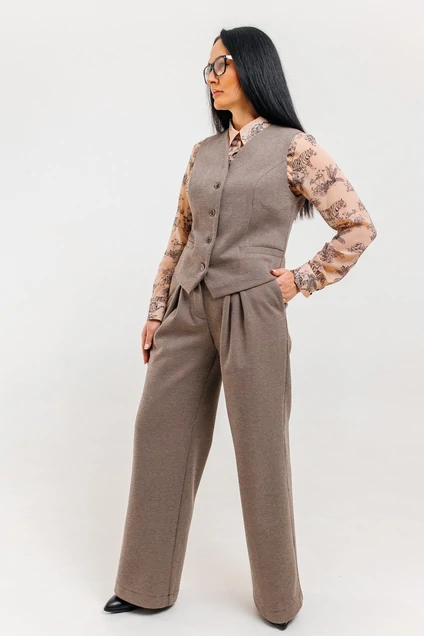 Костюм ДВУХПРЕДМЕТНЫЙ:Жилет полуприлегающего силуэта, на подкладке. По переду рельефа карманы "листочки", застёжка на петли-пуговицы. По спинке вытачки.Брюки-палаццо.По переду бантовая складка.На притачном поясе по спинке резинка.В боковых швах действующие угловые карманы.По переду застежка на монию и пуговицу.