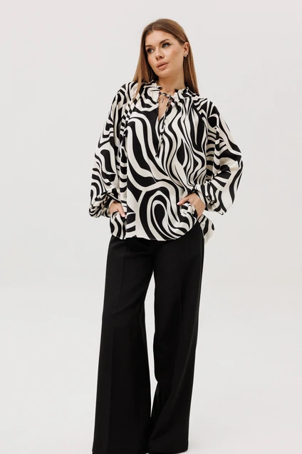 Костюм двухпредметный,состоящий из: блузки и брюк. Блузка свободного силуэта (стиль оверсайз) с рукавом реглан. Горловина с разрезом спереди и притачной планкой с рюшей. Рукав на манжете. Модель без подкладки,не просвечивает.Элегантные женские брюки прямого кроя ,по переду на брючинах стрелки. Модель с высокой посадкой на притачном поясе обеспечивает идеальное прилегание. Спереди расположена практичная застежка на тесьму-молнию, добавляющая удобства при носке. Брюки укомплектованы функциональными боковыми карманами, что придает модели дополнительную практичность и удобство. Эта модель идеально подойдет как для офиса, так и для создания повседневных стильных образов.
