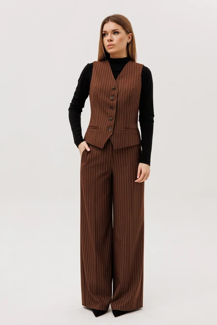 Костюм трехпредметный состоящий из жилета,гольфа, брюк .Жилет прилегающего силуэта,с V- образным вырезом, на подкладке. По переду рельефа карманы "листочки", застёжка на петли-пуговицы. По спинке вытачки.Джемпер женский прилегающего силуэта с втачным одношовным рукавом с воротником-стойкой.Элегантные женские брюки прямого кроя ,по переду на брючинах стрелки. Модель с высокой посадкой на притачном поясе обеспечивает идеальное прилегание. Спереди расположена практичная застежка на тесьму-молнию, добавляющая удобства при носке. Брюки укомплектованы функциональными боковыми карманами, что придает модели дополнительную практичность и удобство. Эта модель идеально подойдет как для офиса, так и для создания повседневных стильных образов. Костюм выполнен из высококачественной итальянской ткани.