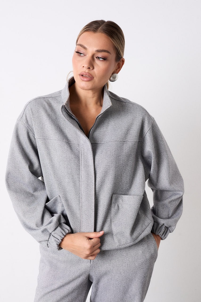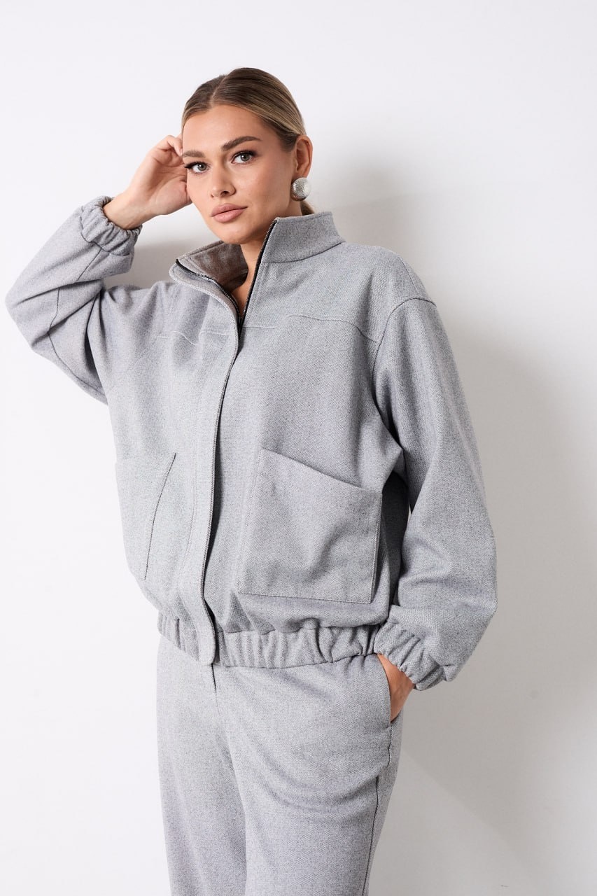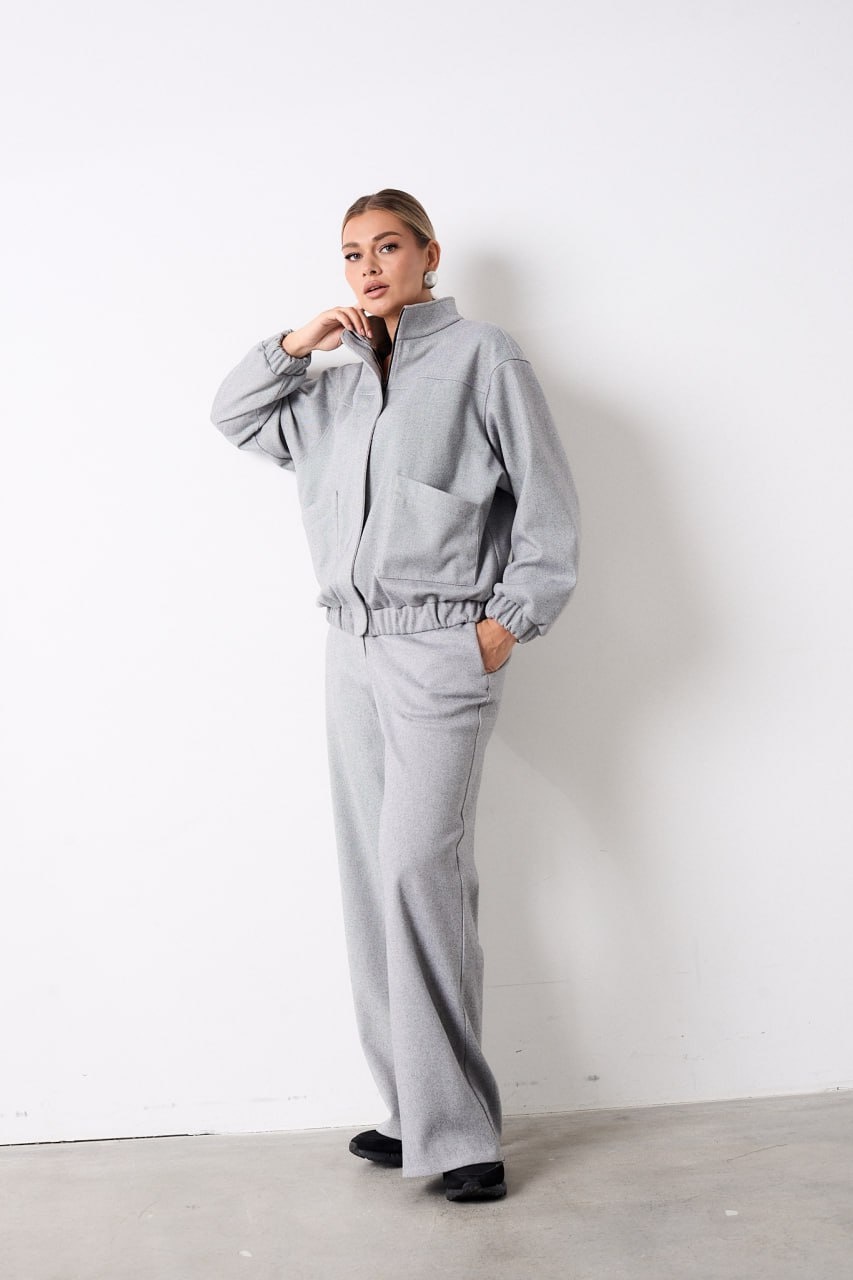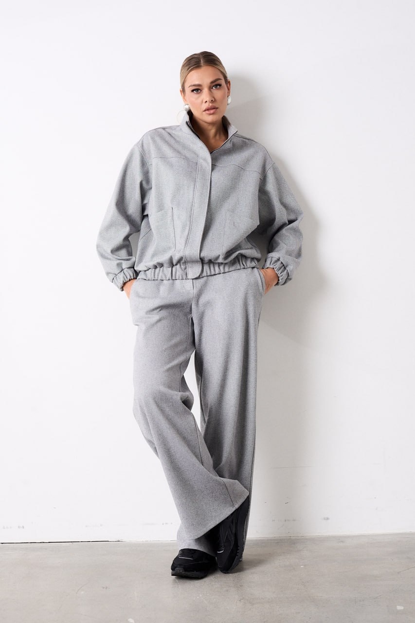 Костюм из трикотажной ткани, состоящий из джемпера и брюк. Джемпер прямого силуэта, по полочке обработана кокетка и в области талии накладные карманы с асимметричным краем, застежка центральная на тесьму молнию закрытая ветрозащитной планкой фиксирующаяся кнопками. Воротник стойка. Низ изделия на притачном поясе с эластичной тесьмой. Линия плеча слегка спущена, рукав втачной по низу притачная манжета с эластичной тесьмой. Брюки прямого силуэта, в боковых швах обработаны карманы. Верхний срез обработан притачным поясом по задним половинкам для лучшей посадки вставлена резинка, застегивающийся на петлю и пуговицу, застёжка центральна с гульфиком и откоском на тесьму