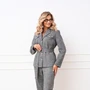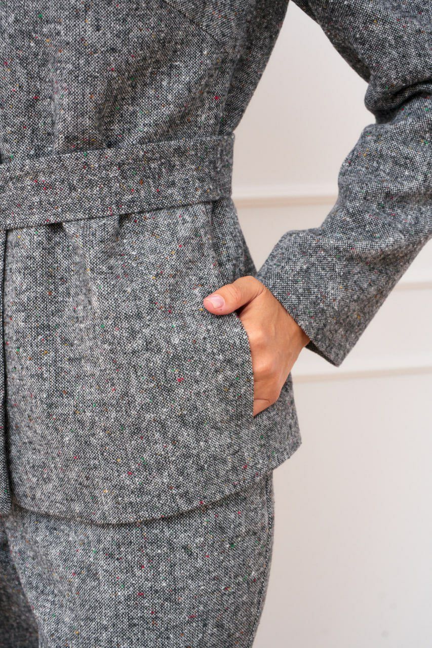 Костюм женский состоящий из жакета и прямых брюк, зауженных к низу. Жакет прямого силуэта с воротником пиджачного типа и центральной застежкой на петли и пуговицы. По полочке обработана кокетка, в шов которой вставлен отделочный клапан. В шве рельефа обработан карман. Рукав втачной, двухшовный. Спинка со средним швом и рельефами. Верхний срез обработан притачным поясом по задним половинкам для лучшей посадки вставлена резинка, застегивающийся на петлю и пуговицу, застёжка центральна с гульфиком и откоском на тесьму молнию, в боковых швах обработаны функциональные карманы с отрезным бочком. Костюм дополнен съёмным поясом из основной ткани застегивающийся на пряжку-протяжку.