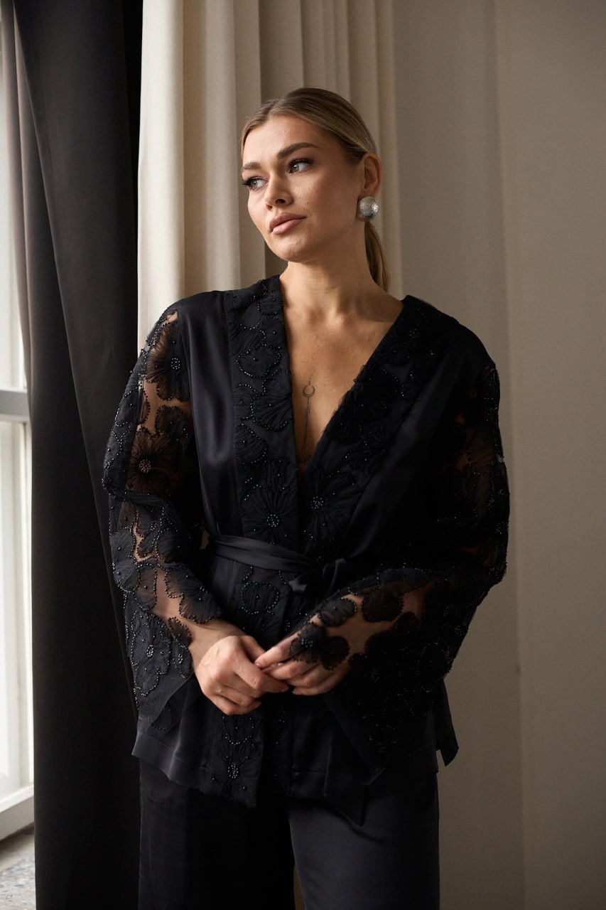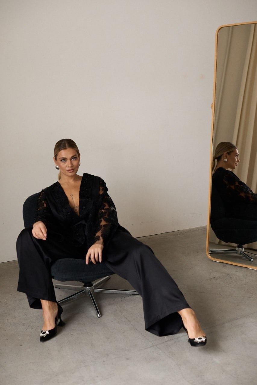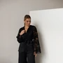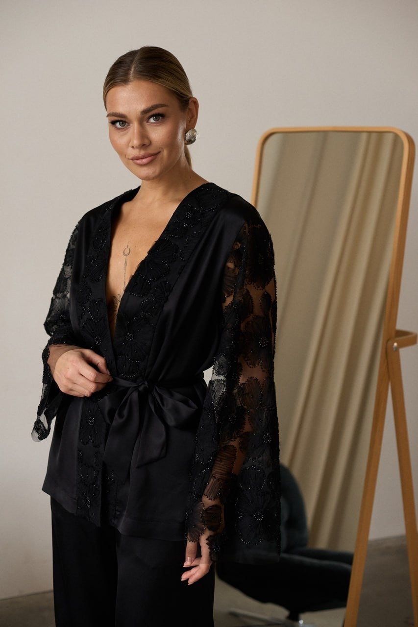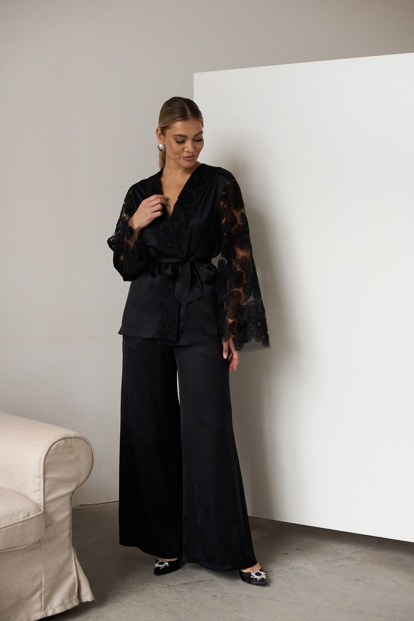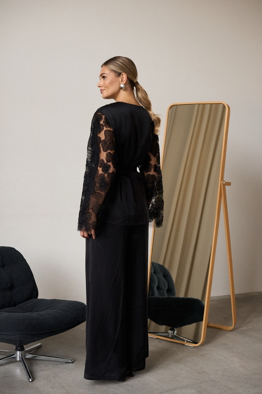 Костюм женский полуприлегающего силуэта из атласа и отделкой из кружевной ткани. Жакет полуприлегающего силуэта, застежка центральная обработана широкой приточной планкой из отделочной ткани. Рукав втачной, немного расклешённый к низу из отделочной кружевной ткани.