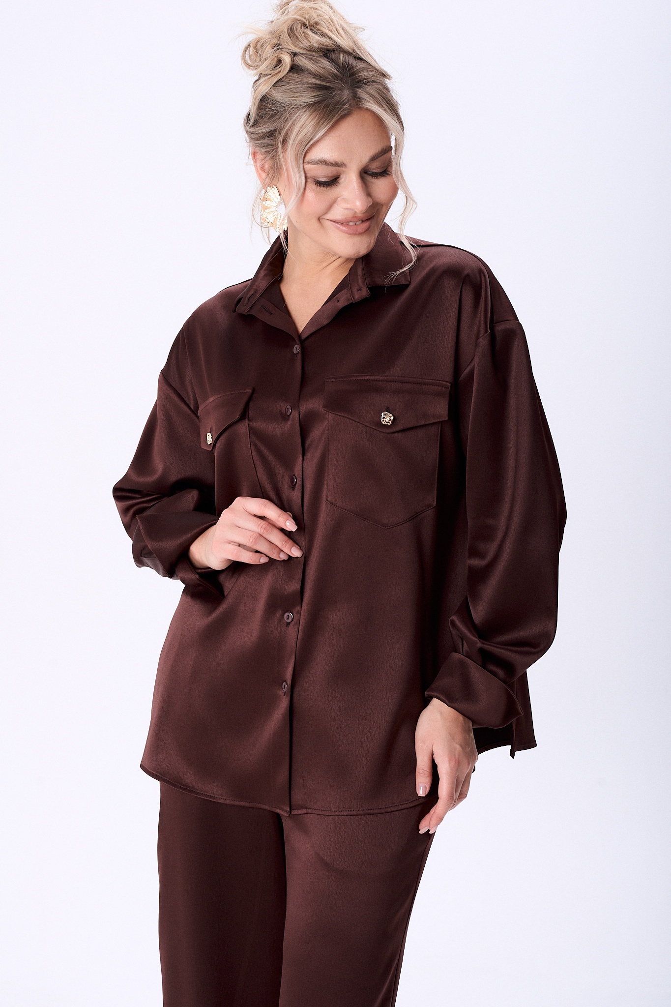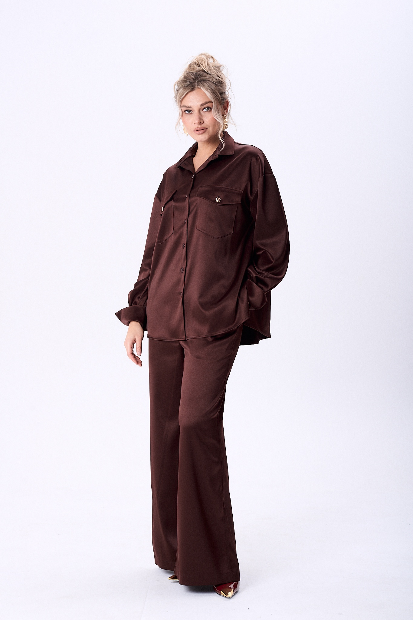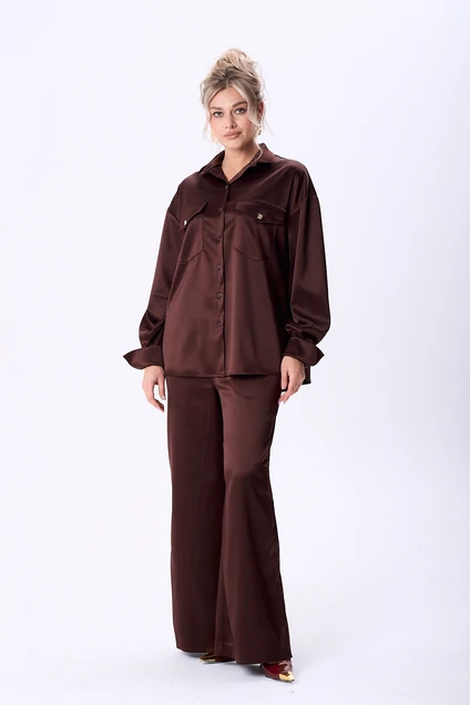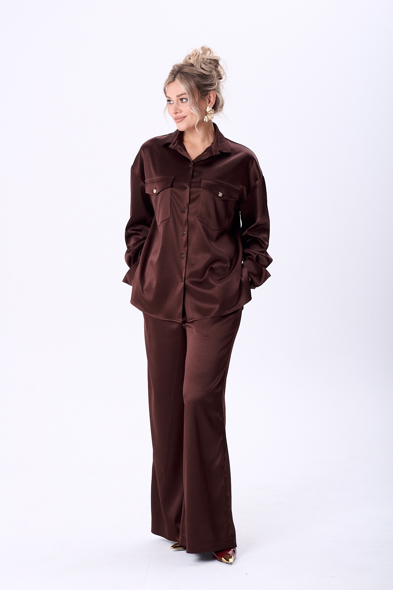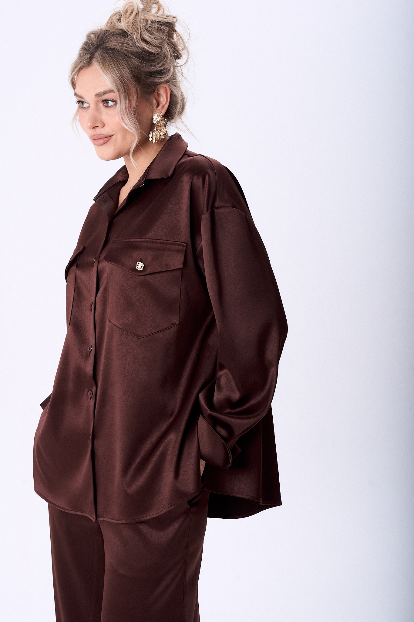 Костюм женский из вискозной ткани с сатиновым блеском свободного силуэта что обеспечит комфорт и идеальную посадку. Рубашка полуприлегающего силуэта со спущенной линией плеча, с центральной застежкой на петли и пуговицы, воротник рубашечный. На полочке в области груди настрочены накладные карманы и клапаны, которые фиксируются на петлю и пуговицу. Рукав длинный по низу притачная манжета, застегивающаяся на петлю и пуговицу. По спинке обработана двойная кокетка, для более комфортной посадки спинка присборена по шву притачивания кокетки.
