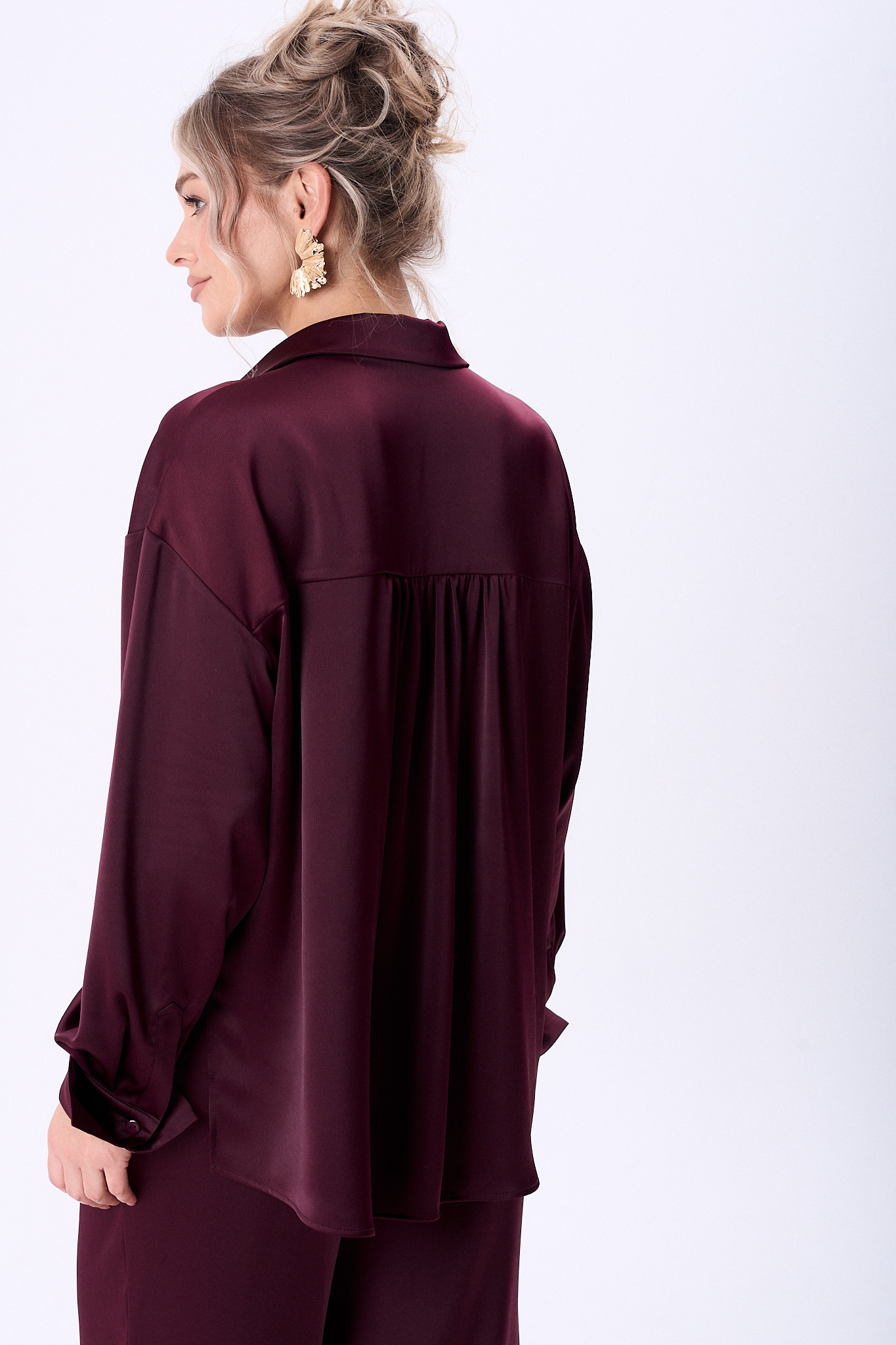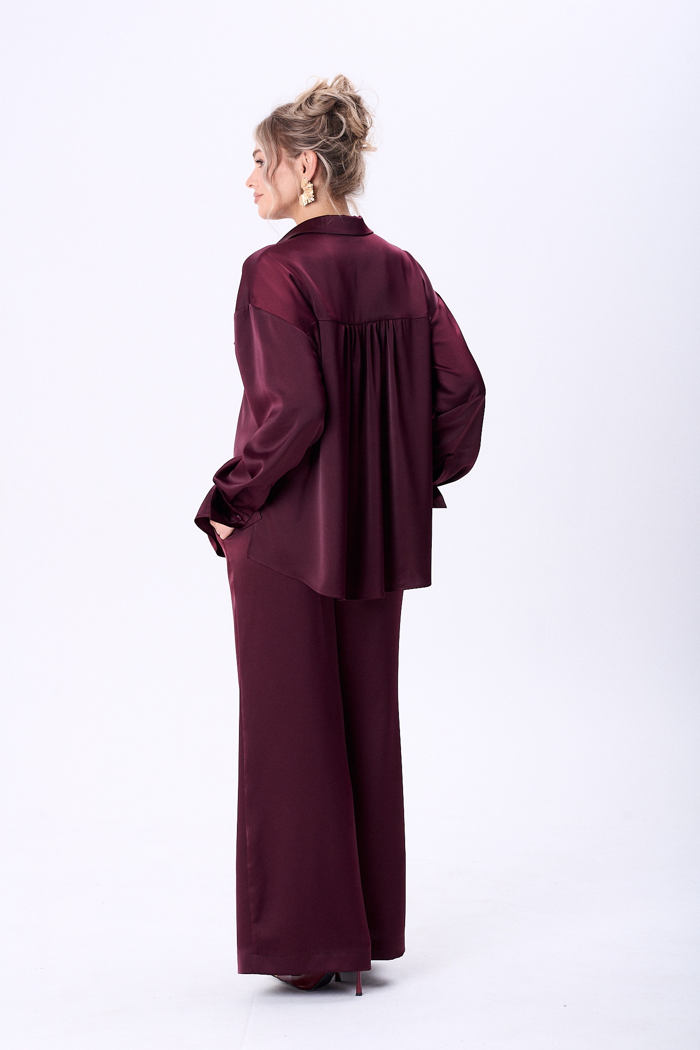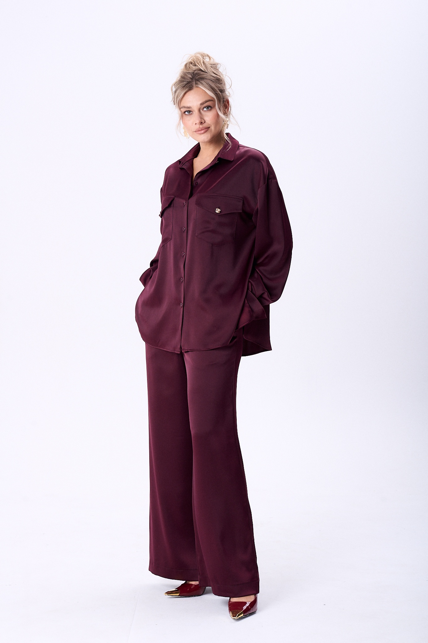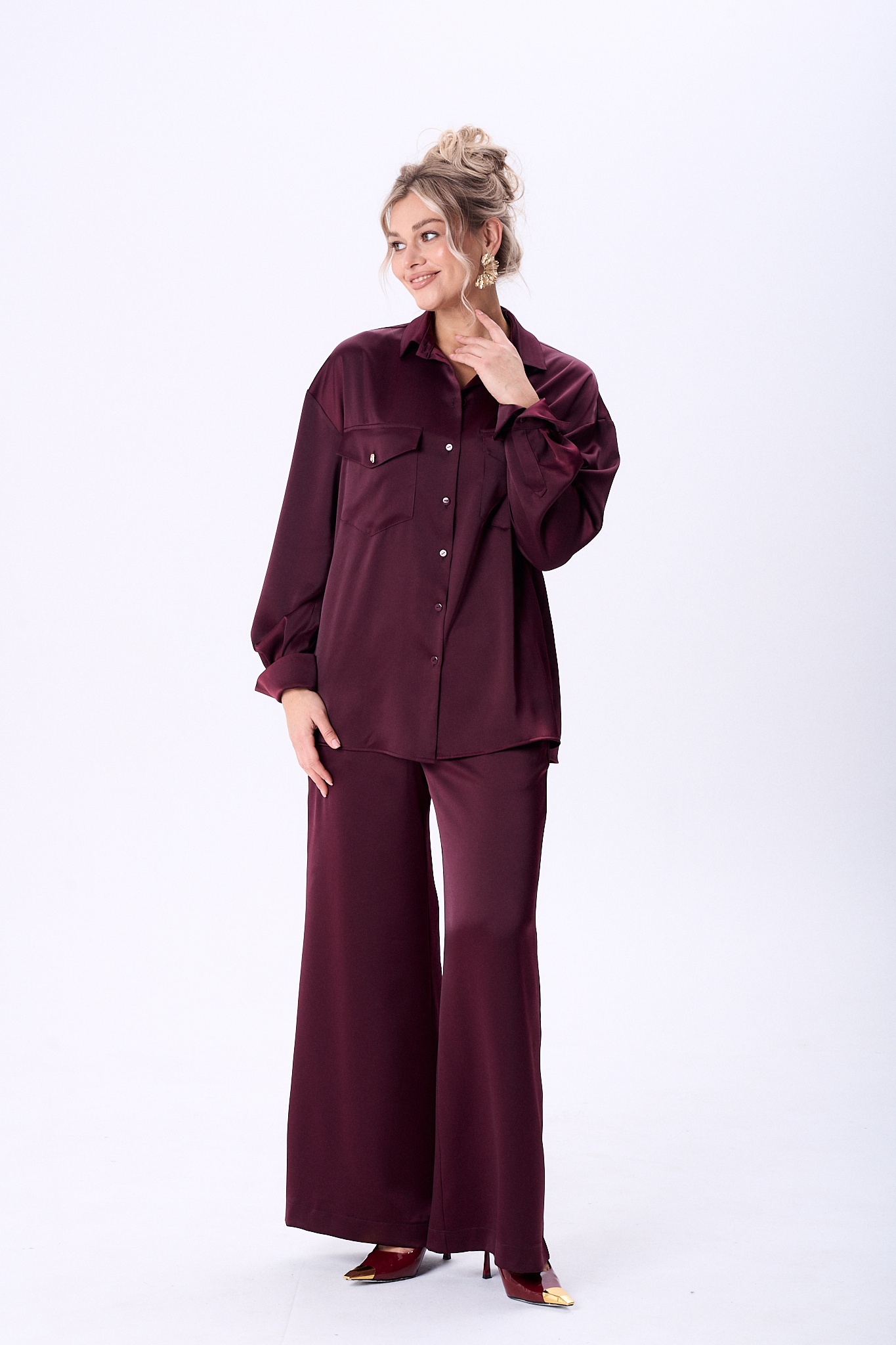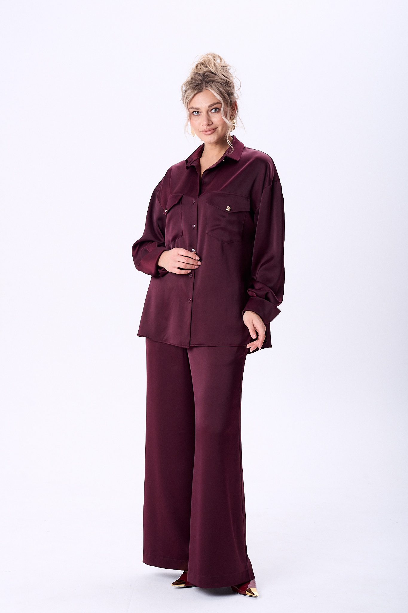 Костюм женский из вискозной ткани с сатиновым блеском свободного силуэта что обеспечит комфорт и идеальную посадку. Рубашка полуприлегающего силуэта со спущенной линией плеча, с центральной застежкой на петли и пуговицы, воротник рубашечный. На полочке в области груди настрочены накладные карманы и клапаны, которые фиксируются на петлю и пуговицу. Рукав длинный по низу притачная манжета, застегивающаяся на петлю и пуговицу. По спинке обработана двойная кокетка, для более комфортной посадки спинка присборена по шву притачивания кокетки.
