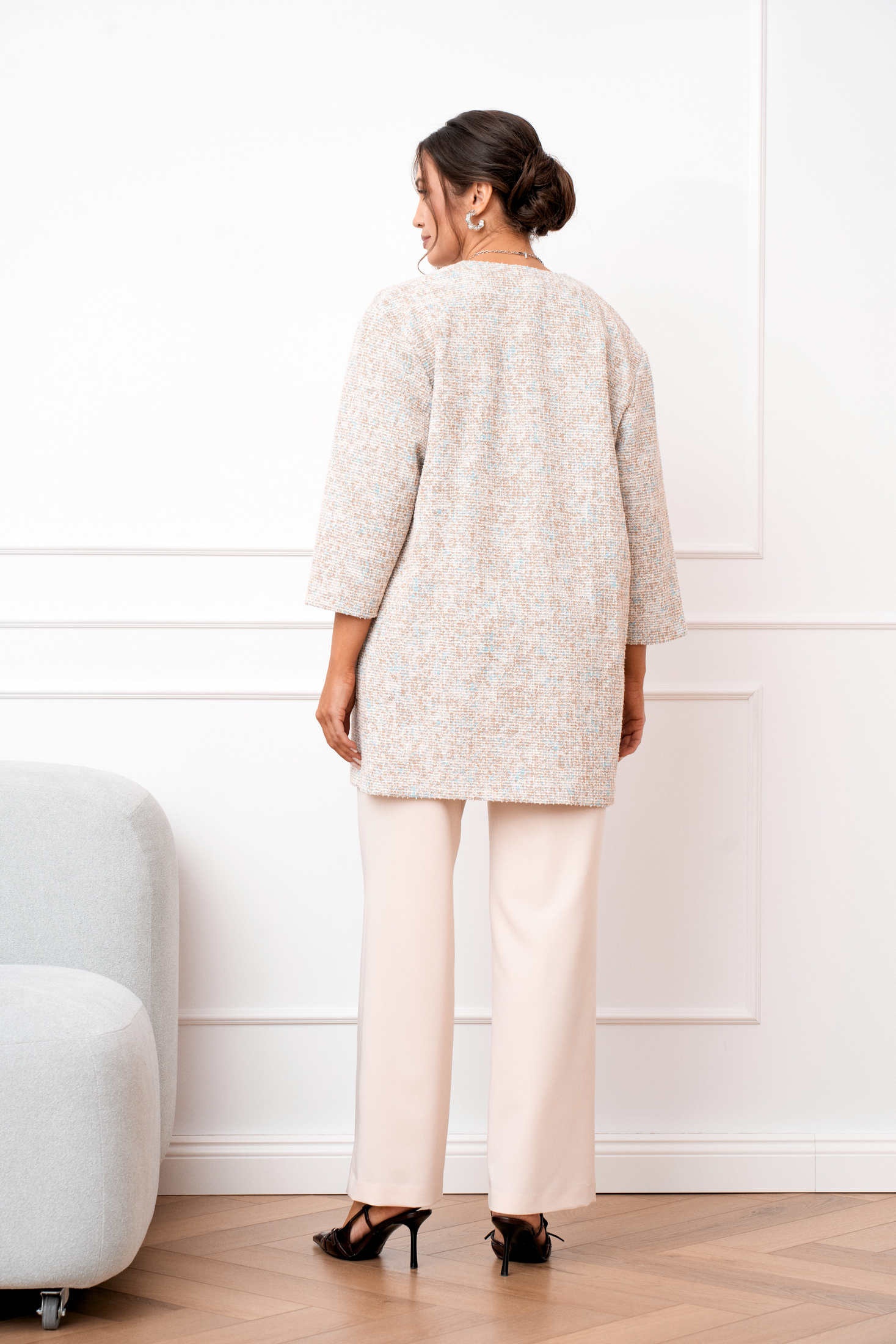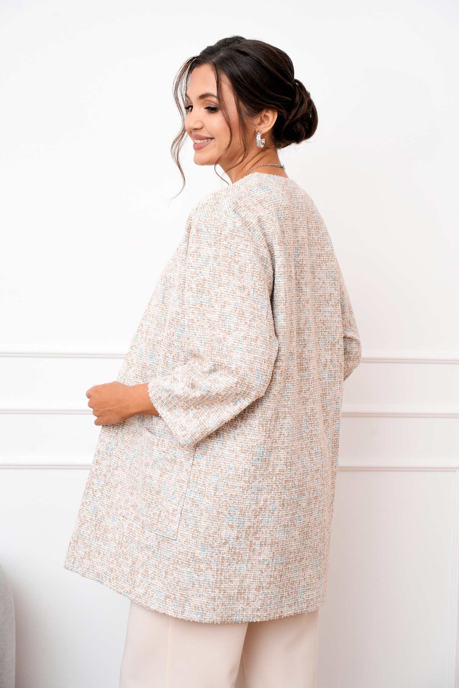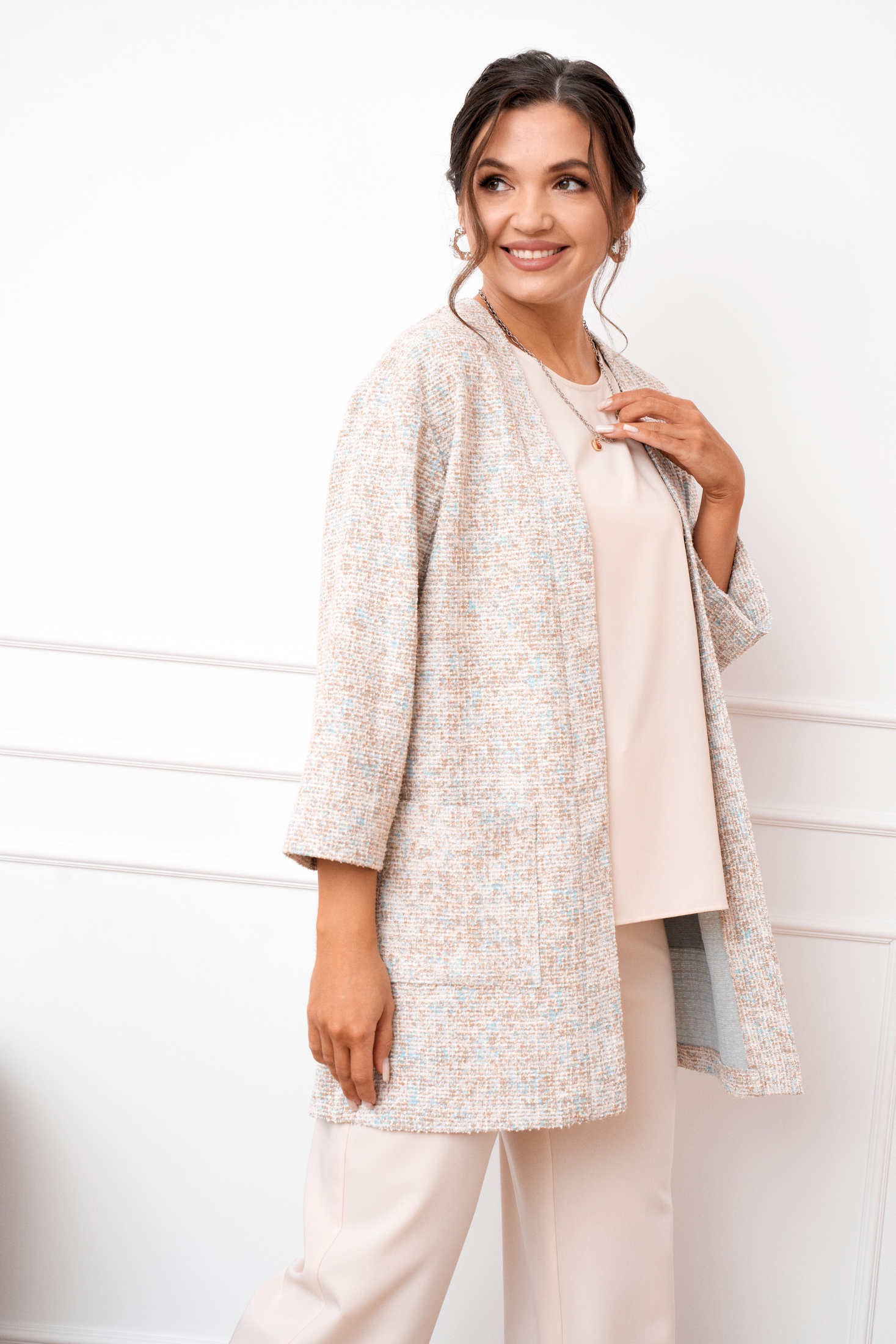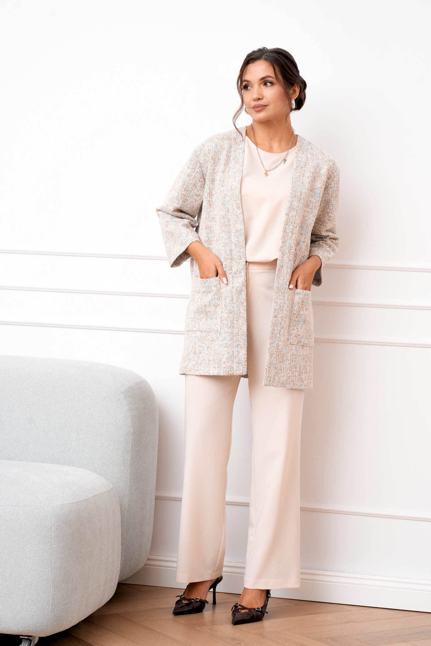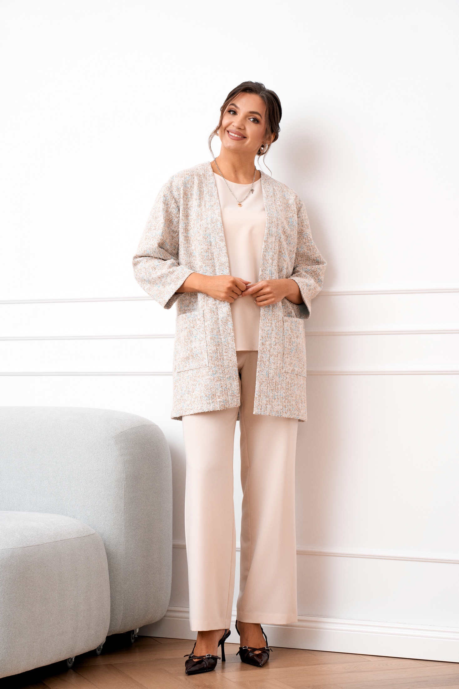 Костюм брючный 1107 AMUAR — это идеальное сочетание комфорта и стиля. Коллекция бренда AMUAR предлагает тройку, состоящую из облегчённого жакета, блузки и брюк. Жакет удлинённый из трикотажа букле, прямого силуэта с длинным 7/8 рукавом и накладными карманами, отлично подходит для прохладных дней. Брюки прямого кроя с эластичной тесьмой на поясе обеспечивают отличную посадку и комфорт в течение всего дня. Блузка полуприлегающего силуэта без рукавов добавляет лёгкости и свободы движениям. Нежный бежевый цвет и универсальный стиль делают костюм подходящим для офиса и отдыха, особенно в демисезонное время. Центральные застёжки и универсальный крой позволяют создавать стильные образы для любого случая.