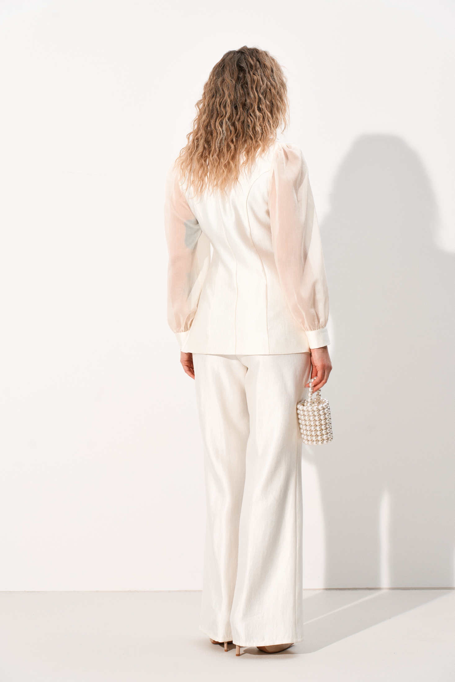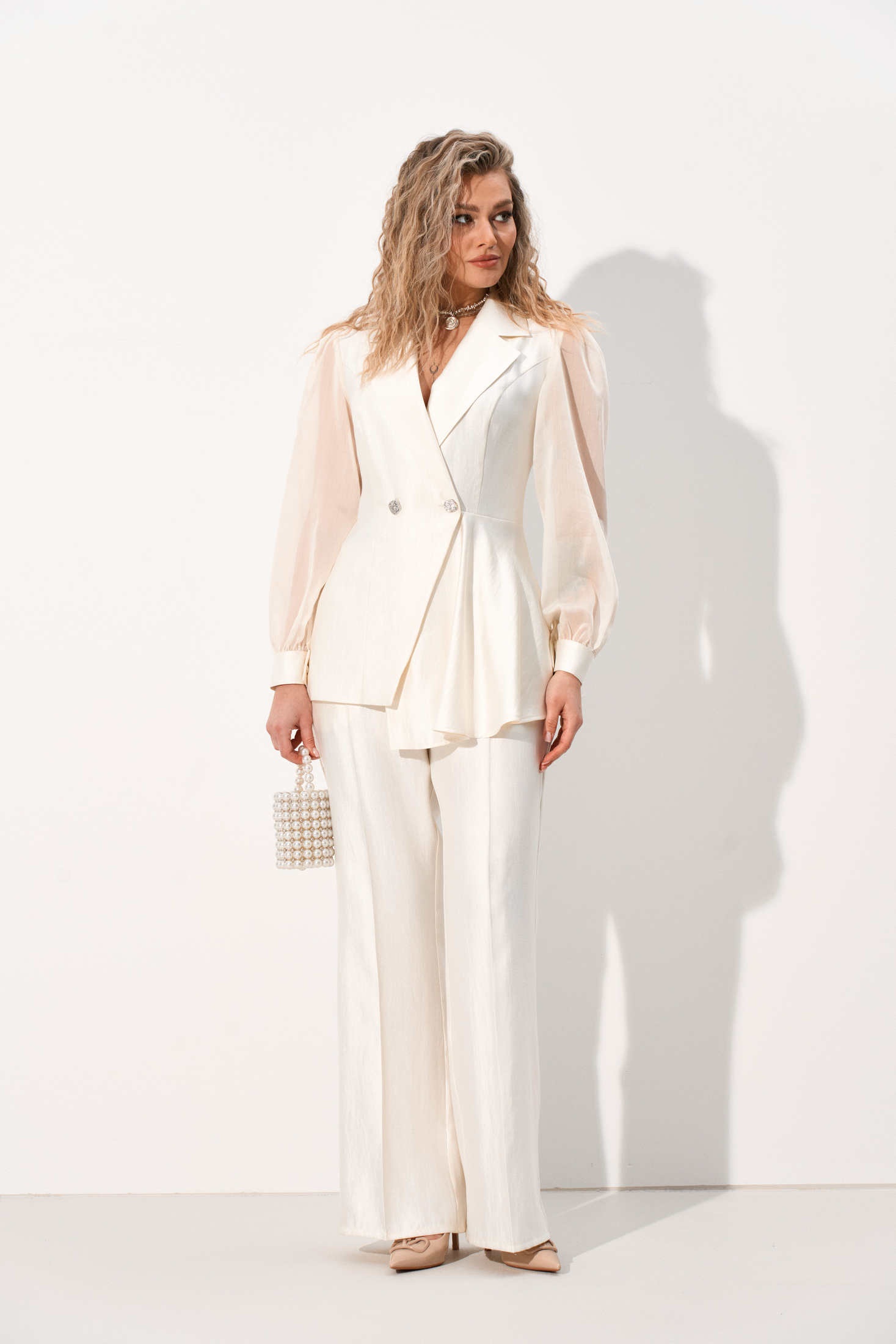 Костюм брючный 1111 AMUAR предлагает изысканный образ для современных женщин. Коллекция бренда AMUAR выполнена из костюмной ткани с перламутровым отливом, что придаёт изделию особый шик. Полуприлегающий силуэт жакета с асимметричным покроем и баской подчёркивает индивидуальность. Втачные рукава из полупрозрачной органзы с нежной сборкой придают легкость образу, а манжеты на пуговицу добавляют утончённости. Брюки прямого силуэта с лёгким расклешением и удобными карманами подчеркивают безупречный стиль. Центральные застёжки на молнию и пуговицы, а также эластичность пояса обеспечивают идеальную посадку. Подходит для весеннего сезона и деловых встреч. Цвет молочный придаёт свежесть и элегантность всему наряду.
