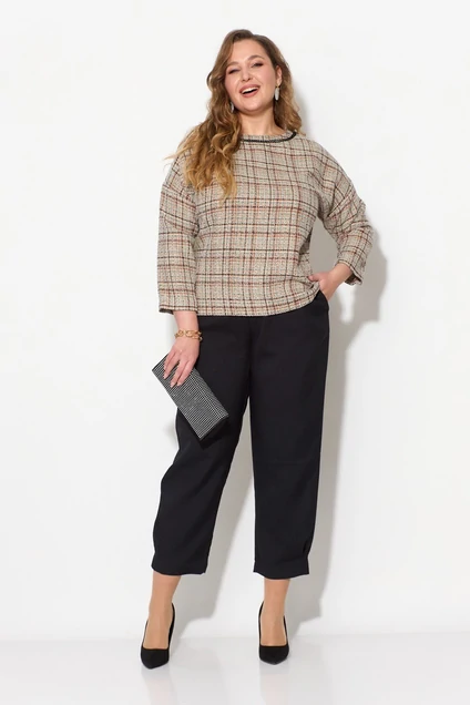 Комплект женский 2-х предмеиный ( блузка, брюки) из текстилькой ткани. Блуза прямого силуэта со спущенным плечом. По горловине спинки и полочки идет отделка тесьмой.Брюки из текстильной ткани, прямые, зауженные к низу за счет защипов. Пояс на резинке, по бокам карманы. Длина блузы (по спинке):(50-54)- 60см. Длина рукава: (50-54)-38см. Длина брюк (50-54) -93см.