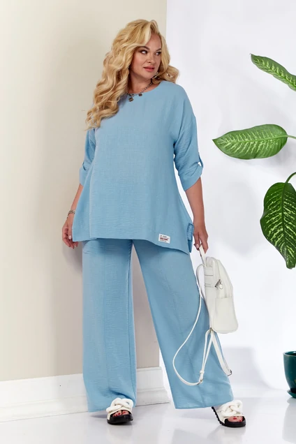 Комплект женский 2-х предметный (блузка, брюки) из тонкой и легкой текстильной ткани- лучший выбор на лето. Отлично подойдет как для повседневной носки (работа, офис, прогулки), так и для праздничных выходов. Достаточно дополнить его соответствующими аксессуарами. Предметы комплекта легко будут сочетаться с вещами из Вашего гардероба. Блузка со спущенным плечом, трапециевидного силуэта с разрезами по бокам. Рукав 3/4 длины с манжетой. Длина рукова фиксируется патой. В качестве декора - нашивка по низу блузки и в верхней части спинки термонаклейка. Брюки прямые, пояс на резинке. По передней части брюк идут подрезы с карманами. Длина по спинке (50-54) - 70 см, (56-60) - 74 см. Длина рукава: (50-60) - 30 см. Длина брюк: (50-54) - 104 см, (56-60) - 107 см