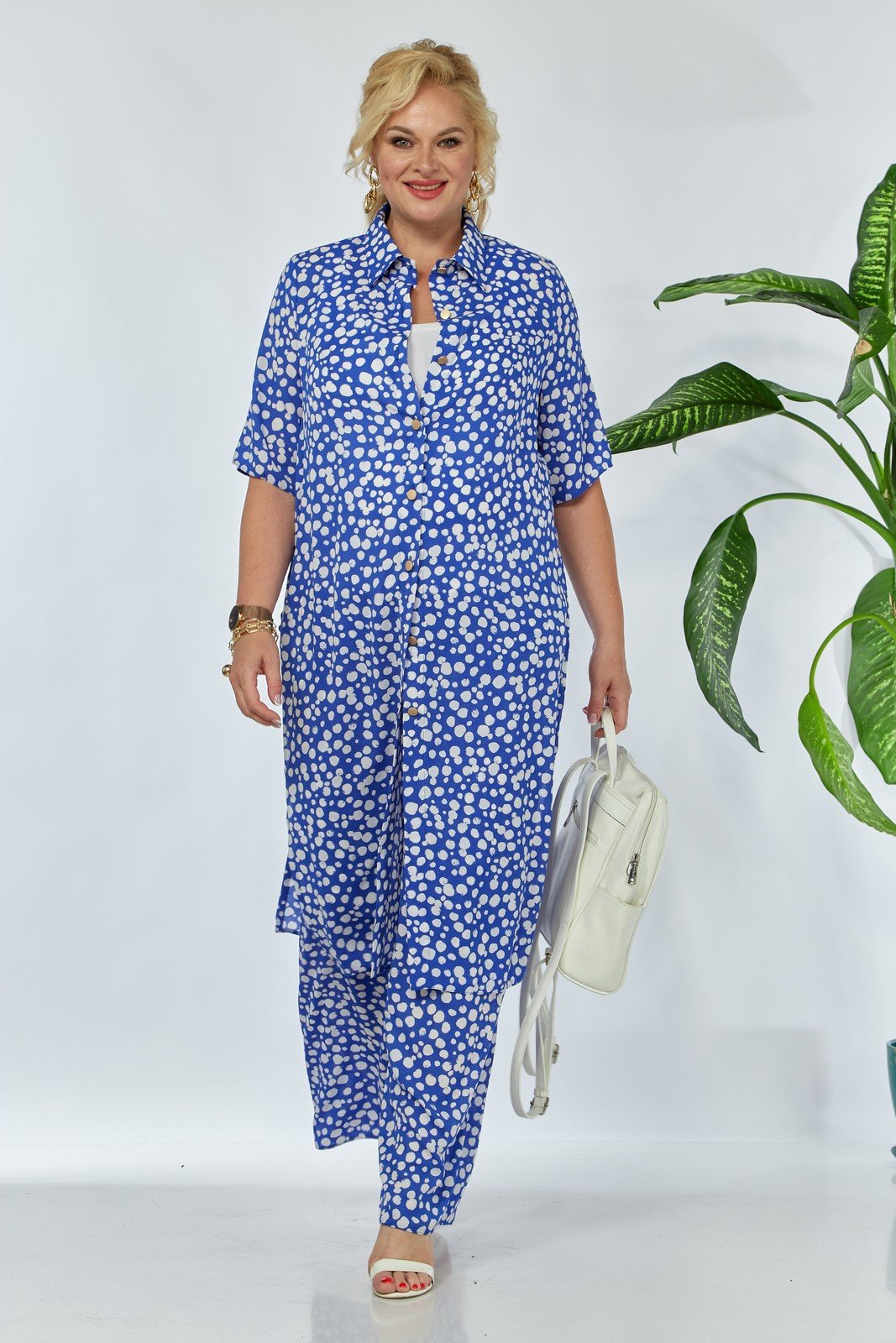 Костюм брючный 1127 синий от бренда Anastasia. Коллекция бренда Anastasia предлагает стильный комплект, включающий блузу и брюки, выполненные из облегченной блузочной ткани, идеально подходящей для летнего сезона. Материал полиэстер обеспечивает комфорт и легкость в уходе. Блуза длиной 112-114 см и рукавом 32-34 см, украшена нагрудными выточками и разрезами по боковым швам. Брюки прямого кроя с поясом на резинке и карманами, длина 100-103 см. Синий цвет с белым геометрическим узором придает образу современный вид. Это идеальный наряд для летних вечеринок, офиса или повседневных прогулок.