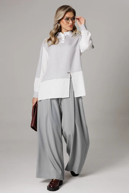 Комплект из костюмной ткани создан для тех, кто ценит комфорт и элегантность в каждой детали. В комплект входит блузка и штаны палаццо. Оверсайз крой придаёт костюму особый шарм и дает свободу движений. Высокая посадка и резинка по поясу подчёркивает талию и делает силуэт более изящным. Благодаря свободному крою костюм подойдёт для разных типов фигуры. Он подчеркнёт вашу индивидупльность. Блузка прямого силуэта, застежка на планку и пуговицы. Воротник на отрезной стойке. По полочке идет ассиметричный подрез со вставками из 2-х видов однотона и разрезом. Плечо спущенное, рукав длинный со вставками, на манжете. По спинке идет кокетка и встречная складка. Брюки полаццо , прямые с односторонней складкой и запахом по центру. По низу брюк широкая подгибка. Пояс на резинке . В качестве декора- брендированная металлическая нашивка по подрезу полочки. Длина по спинке (50-54) - 74 см, (56-60) - 76 см. Длина рукава (с манжетой): (50-54) - 57 см, (56-60)-59см. Длина брюк: (50-54) - 97 см, (56-60) - 98см