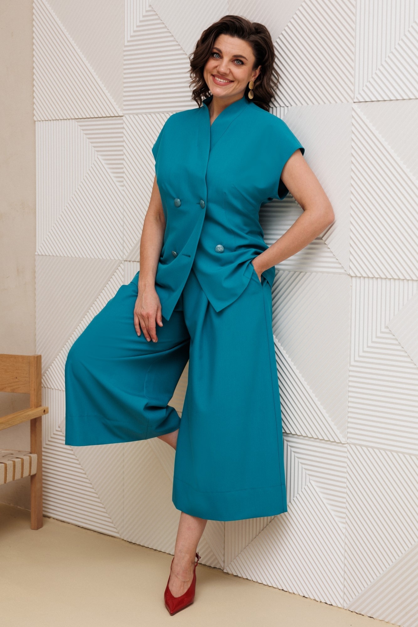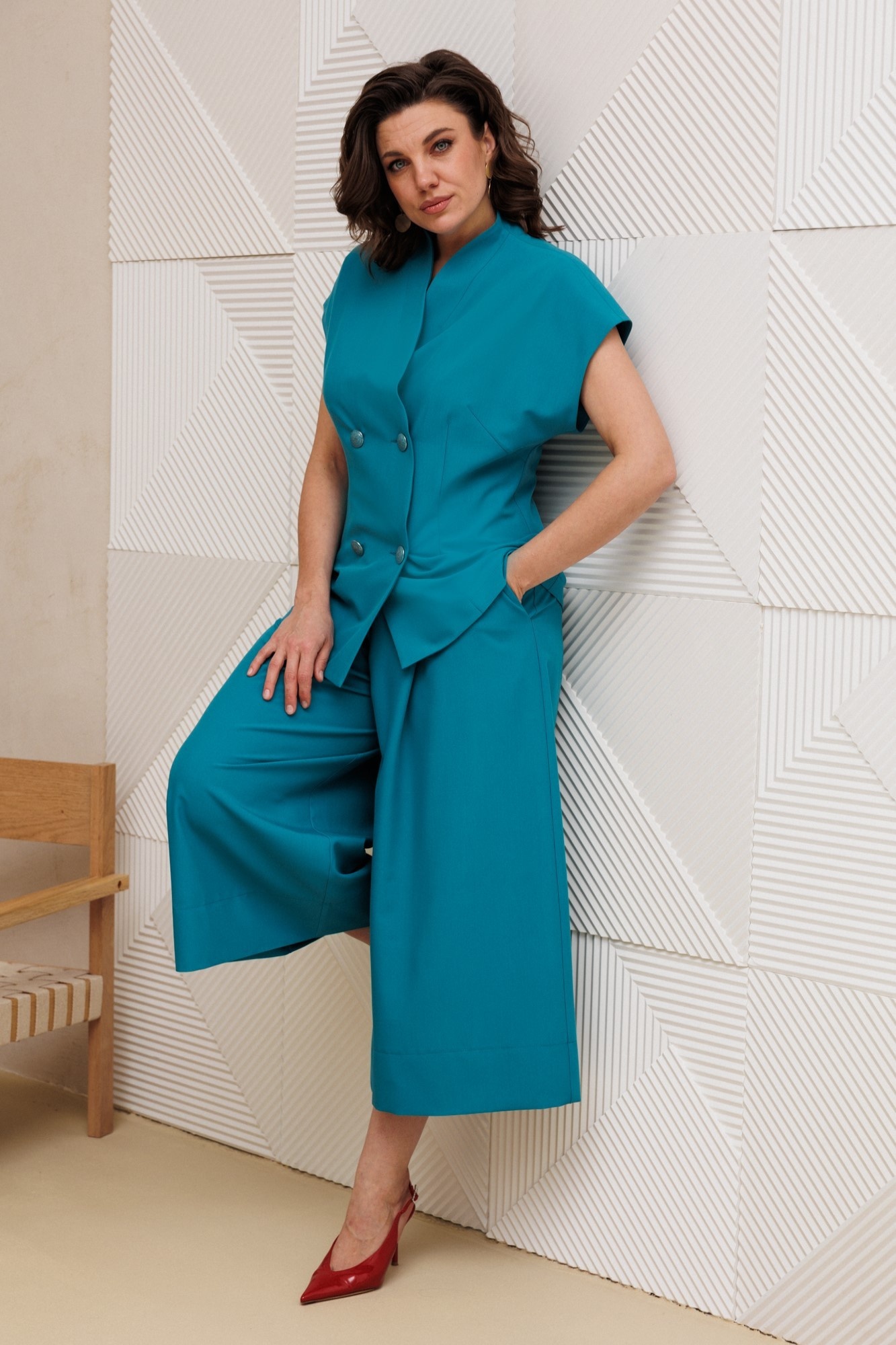 Костюм брючный 1330 морская волна Anastasia — настоящий стильный выбор для вашего гардероба. Коллекция бренда Anastasia предлагает удобный и модный костюм-двойку из костюмной ткани, который подходит для повседневной носки. Материал сочетает полиэстер, вискозу и спандекс, обеспечивая комфорт и эластичность. Жилет полуприлегающего силуэта с двумя рядами пуговиц и цельнокроеной стойкой воротника дополняет образ, а юбка-брюки с широкими встречными складками и потайной молнией добавляют уникальности. Цвет морской волны привносит свежесть в ваш образ, а функциональные карманы делают костюм практичным. Длина по спинке составляет 72-74 см, юбка-брюки — 85 см. Это повседневный костюм идеально подходит для офиса, учебы или прогулок в теплый сезон.