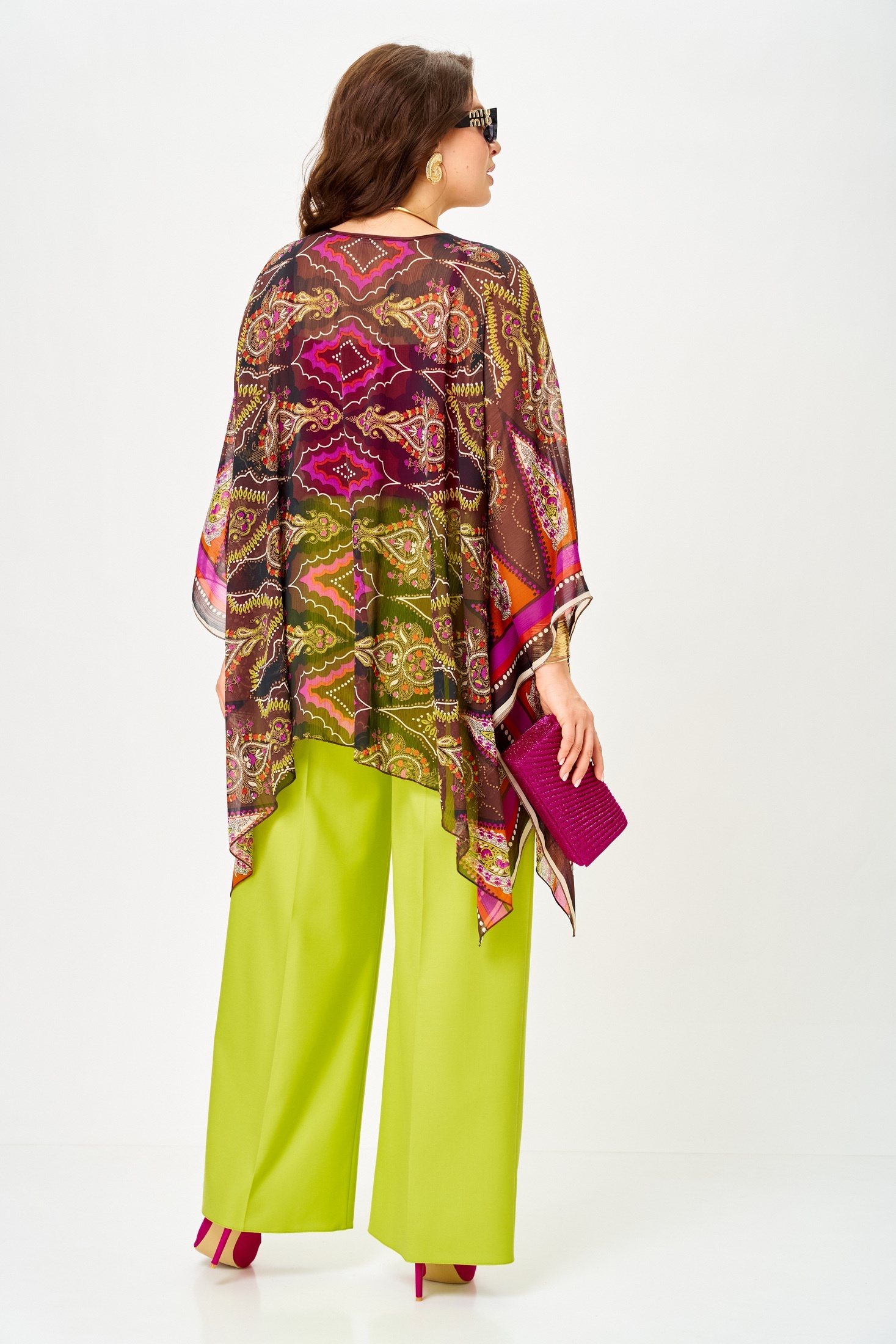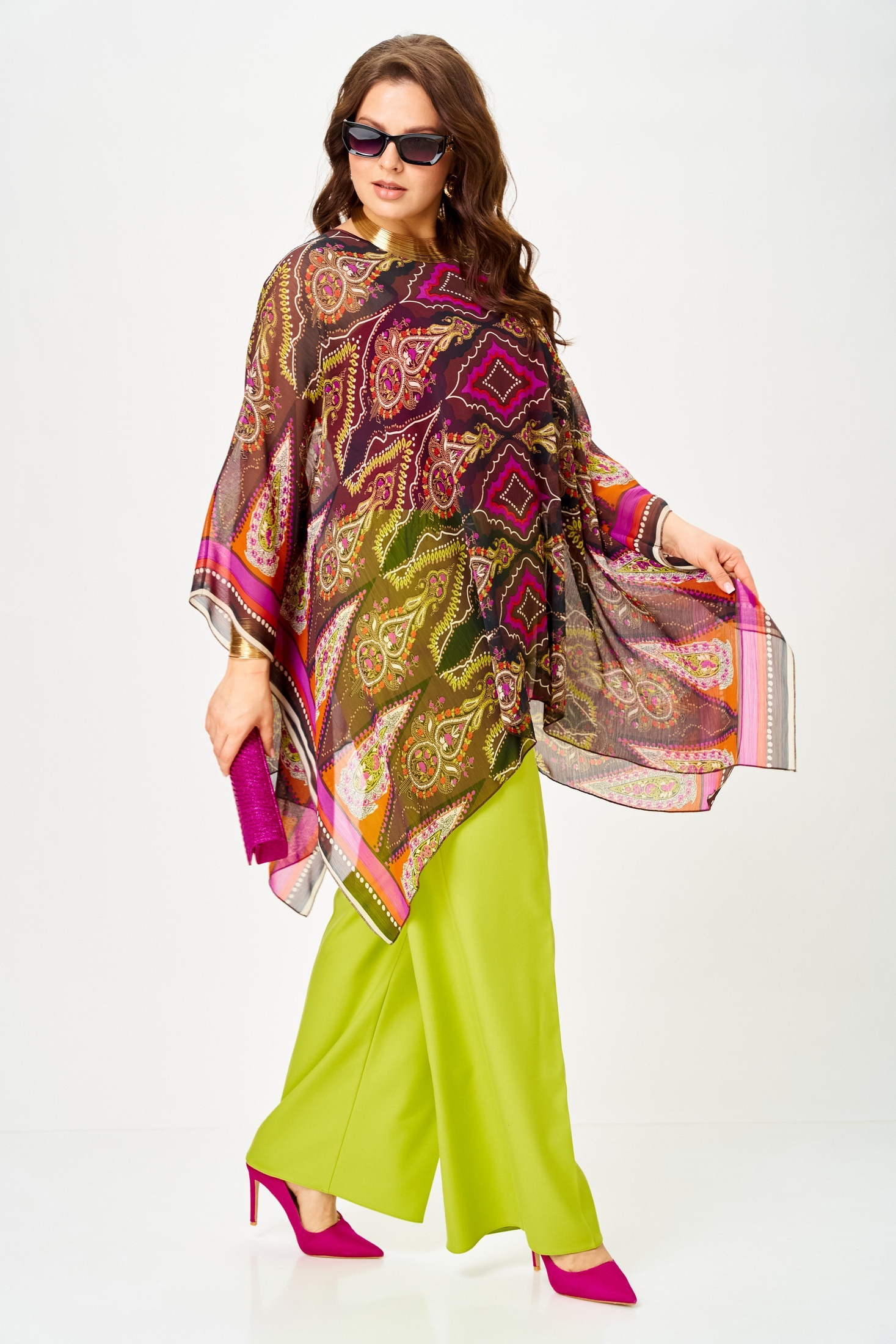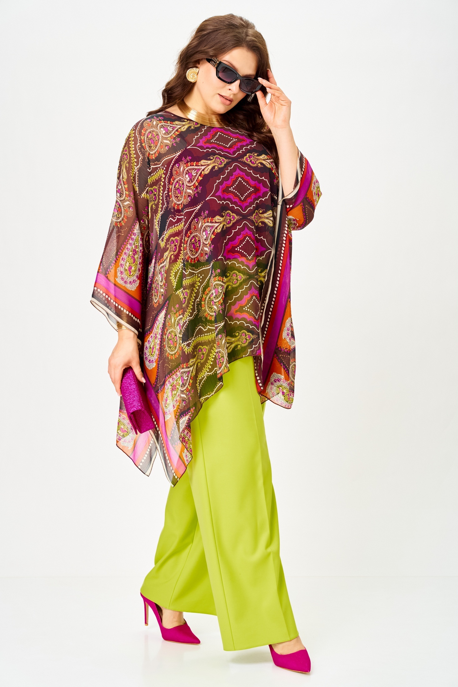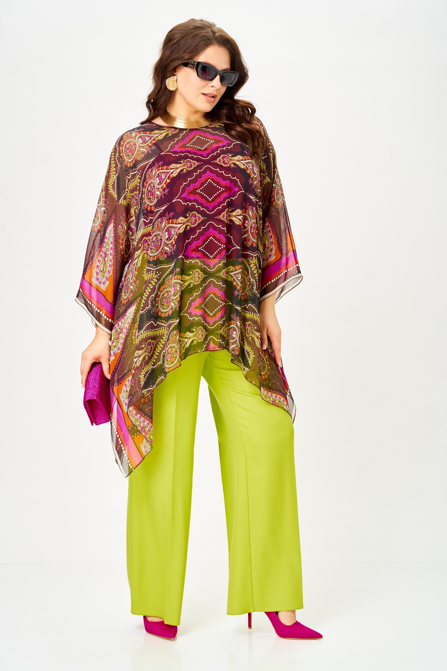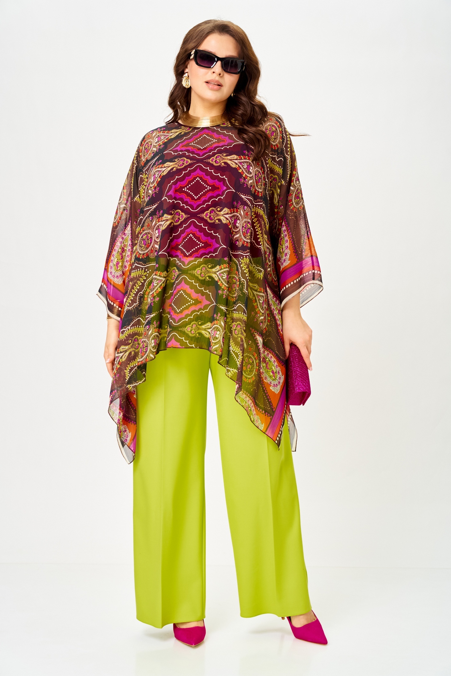 Костюм брючный 1339 лайм+мультиколор Anastasia от бренда Anastasia — это стильный и универсальный комплект, который идеально подойдет для любого повода. Коллекция бренда включает в себя три предмета: туника, топ и брюки. Туника выполнена из легкого купонного шифона, создающего воздушность образа, с длиной в 75 см. Топ на регулируемых бретелях изготовлен из мягкого трикотажного полотна "масло" и имеет длину по спинке 41–43 см. Брюки со стрелками, с поясом на резинке и боковыми карманами, длиной 102–105 см, обеспечат комфорт и элегантность. Этот комплект выполнен в сочных лаймовом и мультиколорных оттенках, что делает его отличным выбором как для повседневных образов, так и для праздничных мероприятий. Идеально подходит для весеннего и летнего сезонов.