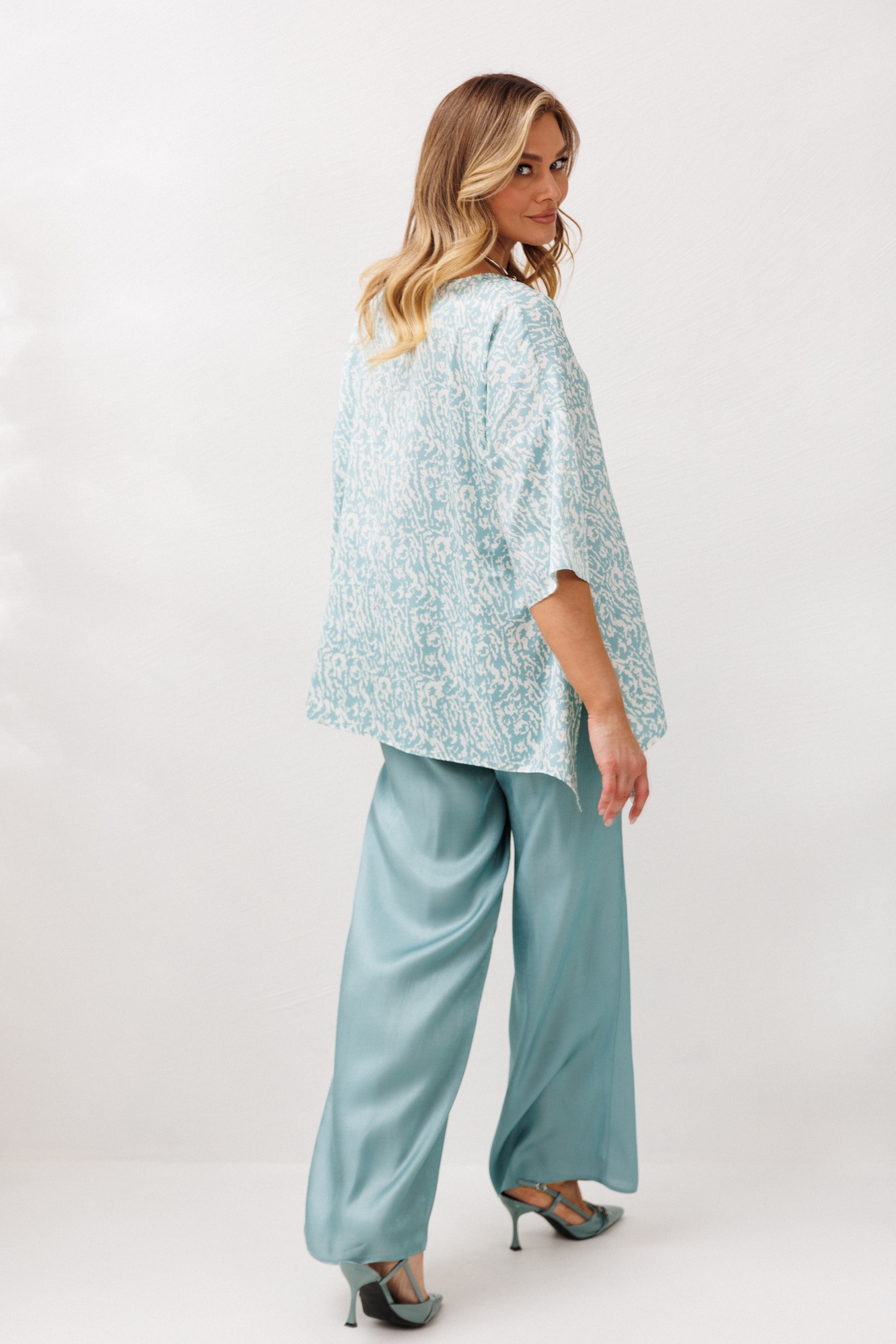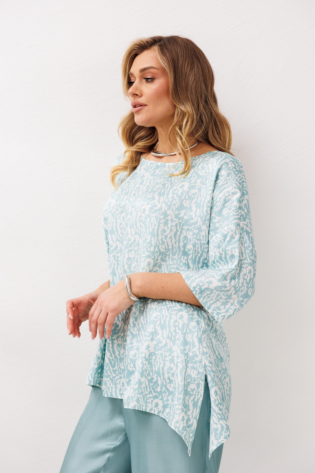 Костюм брючный 1341 бирюзовый Anastasia создаёт нежный и современный образ. Коллекция бренда Anastasia отличается сочетанием ярких оттенков и утонченного дизайна. Комплект из текстильной ткани состоит из блузки с трапециевидным силуэтом и разрезами по бокам, а также прямых брюк с поясом на резинке и карманами. Блузка выполнена из 98% полиэстера и 2% спандекса, что обеспечивает комфорт и эластичность, длина по спинке варьируется от 66 до 70 см. Брюки из вискозы на 90% и полиэстера на 10% подчёркивают лёгкость и воздушность ткани. Бирюзовый цвет в сочетании с универсальным фасоном подходит для повседневного и праздничного стиля. Длина брюк составляет от 103 до 106 см, делая их идеальными для любой погоды и настроения.